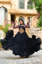 Black Navratri Special 14 Kg Reyon Designer Gown with Kutchi Gamthi & Cotton Print Work