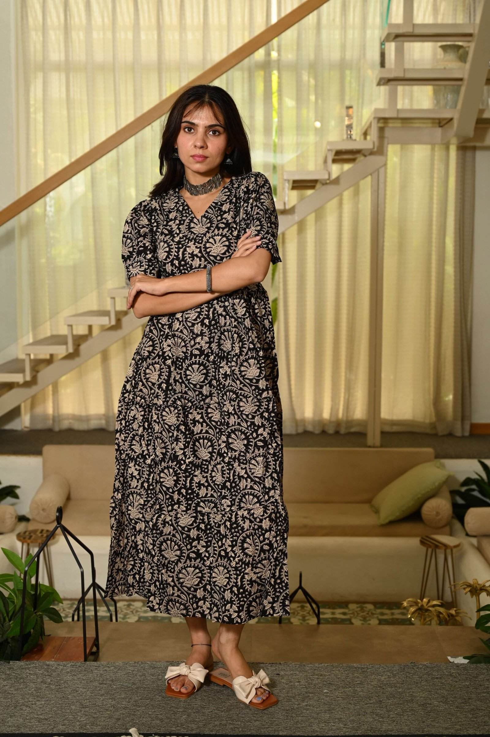 Elevate your everyday look with this Black Floral Printed Cotton Anarkali Maxi Dress, designed to blend comfort with chic style. Crafted from breathable cotton fabric, this dress features a beautiful all-over floral pattern that adds a touch of charm and femininity. The V-neckline and puff sleeves give it a trendy silhouette, while the flared tiered hemline ensures graceful movement with every step.