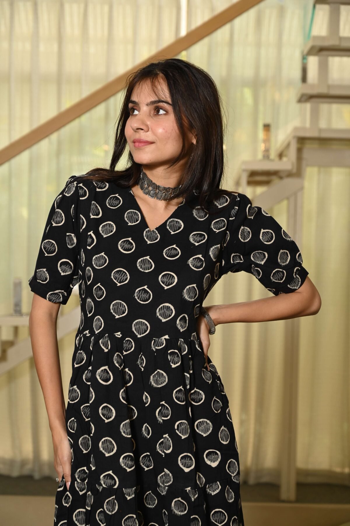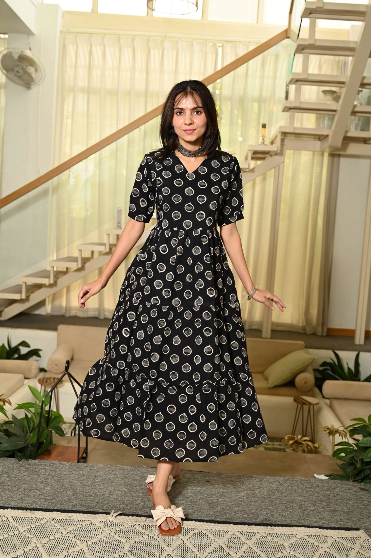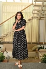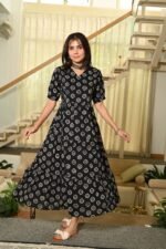 Black Printed Cotton Anarkali Maxi Dress with Puff Sleeves Elegant Casual Wear