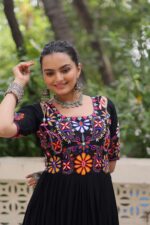 Make a striking style statement this Navratri with our black Reyon gown, crafted with intricate Kutchi Gamthi thread embroidery for an authentic ethnic appeal. The gown is stitched in L size (adjustable from 38″ to 44″ for comfort) and features a graceful 54-inch length for a perfect festive fit.