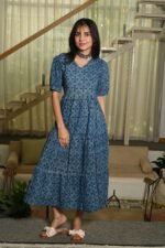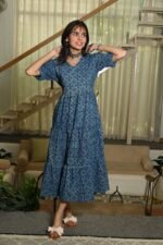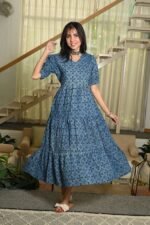 Elevate your everyday look with this Blue Floral Printed Cotton Anarkali Maxi Dress, designed to blend comfort with chic style. Crafted from breathable cotton fabric, this dress features a beautiful all-over floral pattern that adds a touch of charm and femininity. The V-neckline and puff sleeves give it a trendy silhouette, while the flared tiered hemline ensures graceful movement with every step.