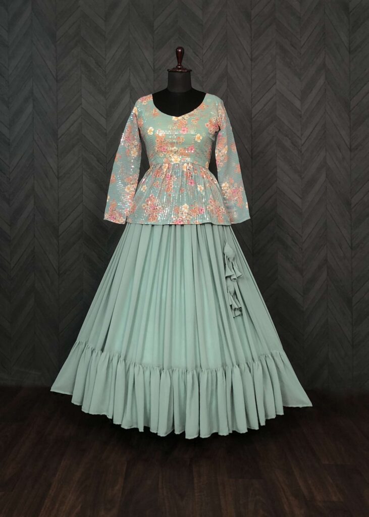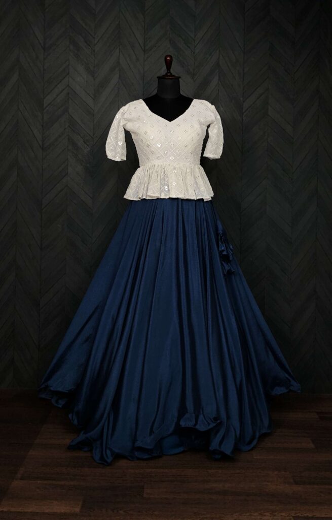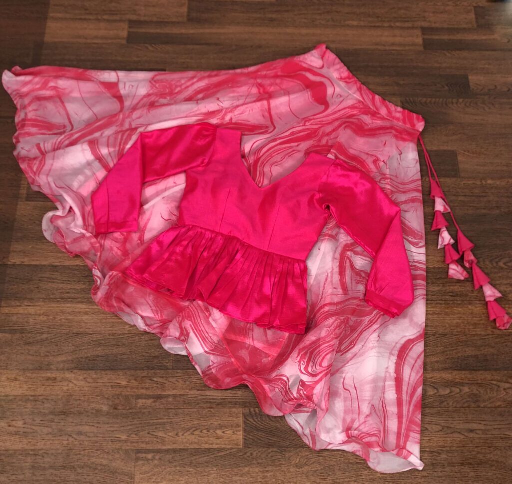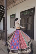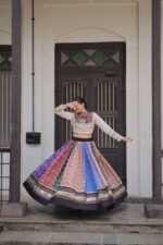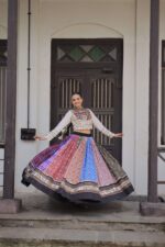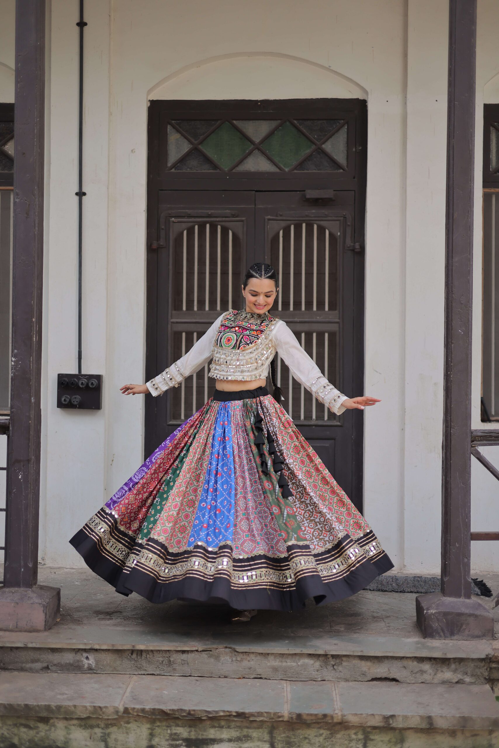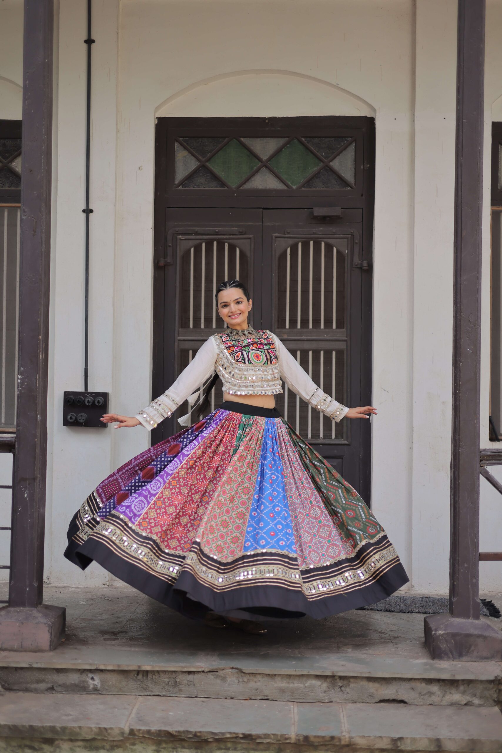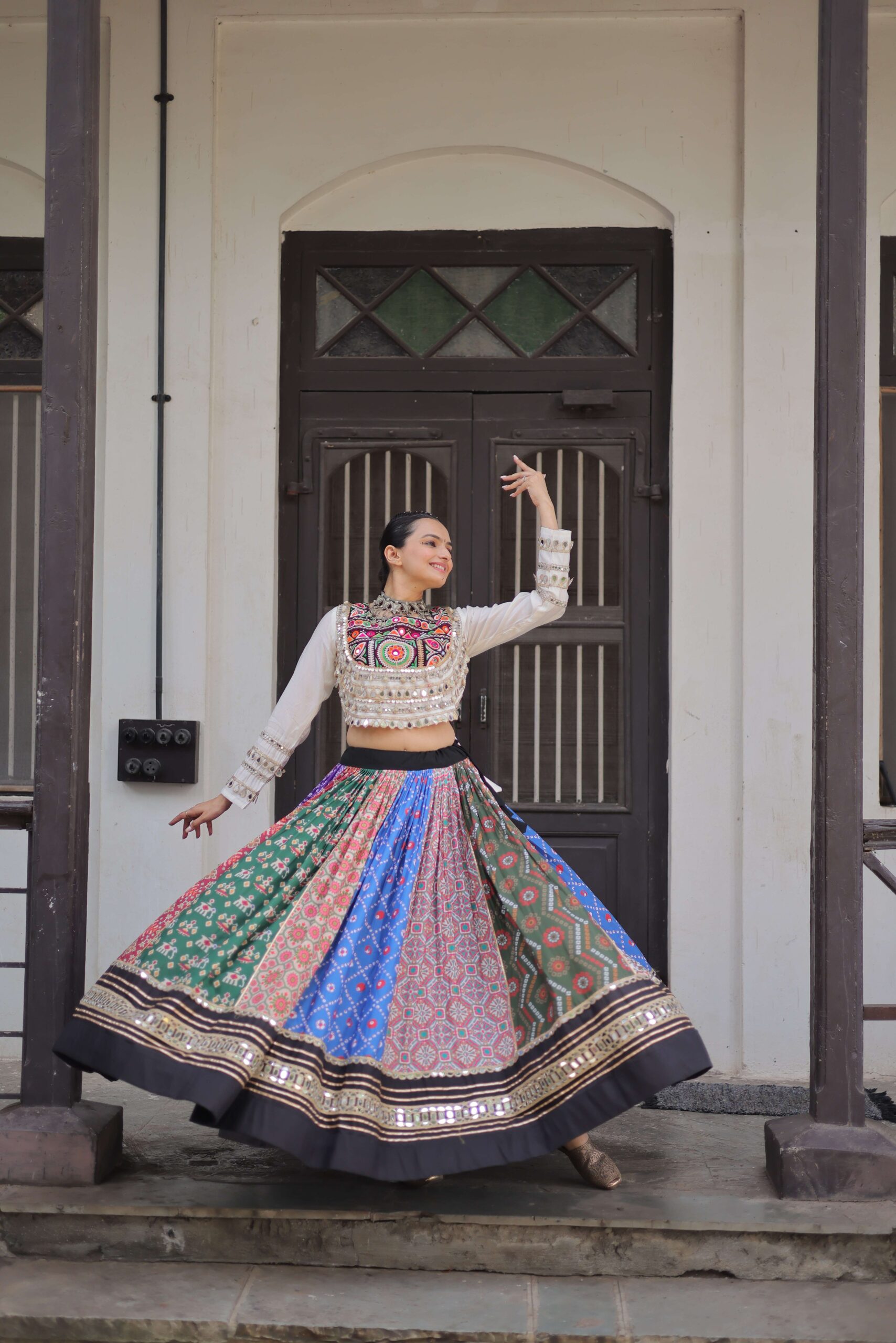 Step into the festive season with this elegant Navratri lehenga choli set. The full-stitched cotton printed lehenga is adorned with attractive Gota-Patti and real mirror lace work, featuring a 4-meter flare with canvas patta stitching for graceful movement. The coordinating Roman fabric top showcases intricate Kutchi Gamthi embroidery with mirror lace accents, designed in a classic blouse pattern with adjustable sizing for comfort. Lightweight yet striking, with a soft cotton inner lining and dori drawstring closure, this ensemble is perfect for garba, festive gatherings, or cultural celebrations. A perfect blend of tradition, craftsmanship, and festive charm.