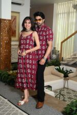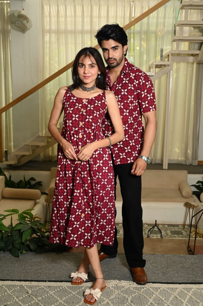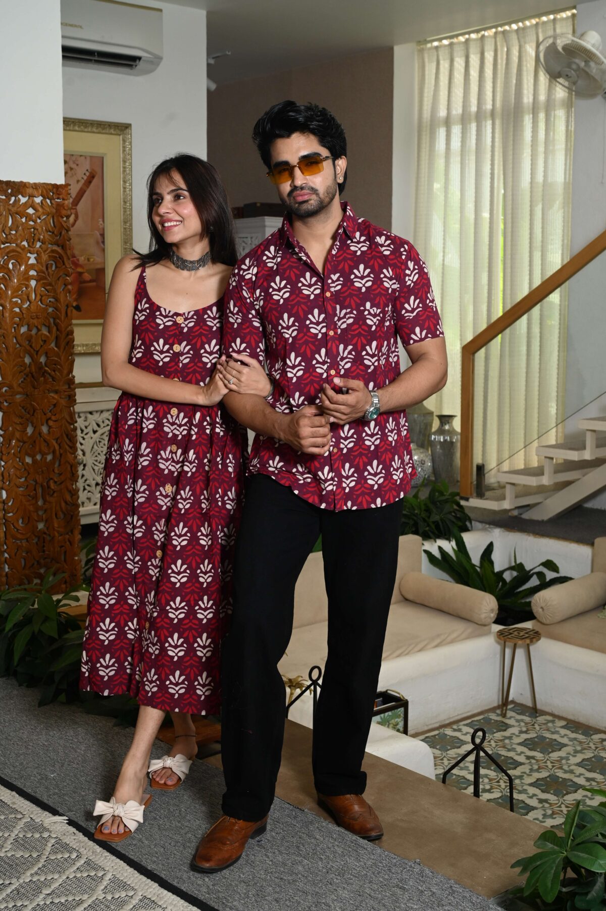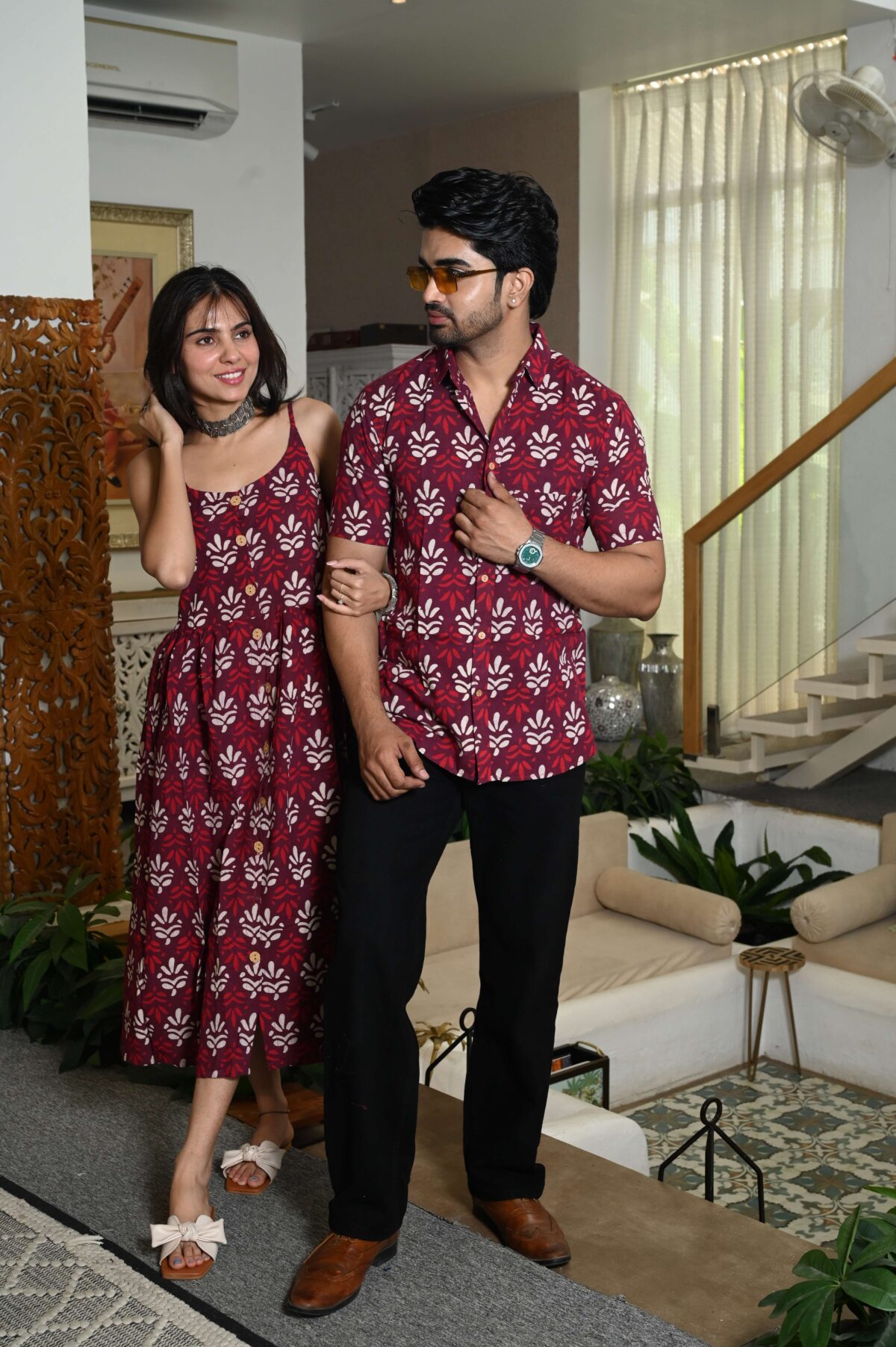 Couple Matching Outfit ? Maroon Cotton Floral Printed Midi Dress & Shirt Set, Summer Casual Wear