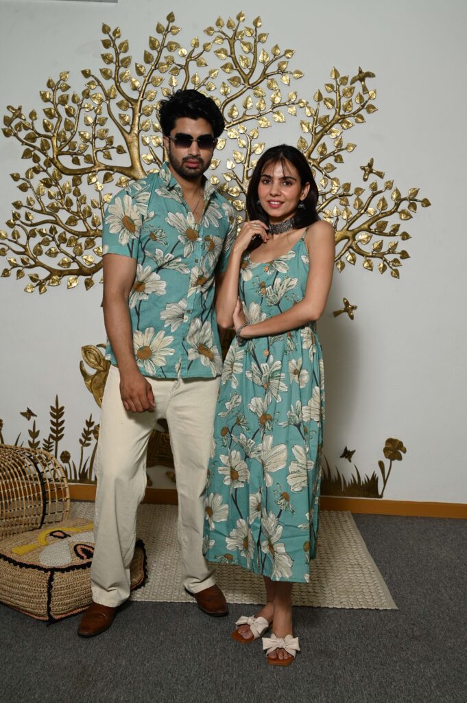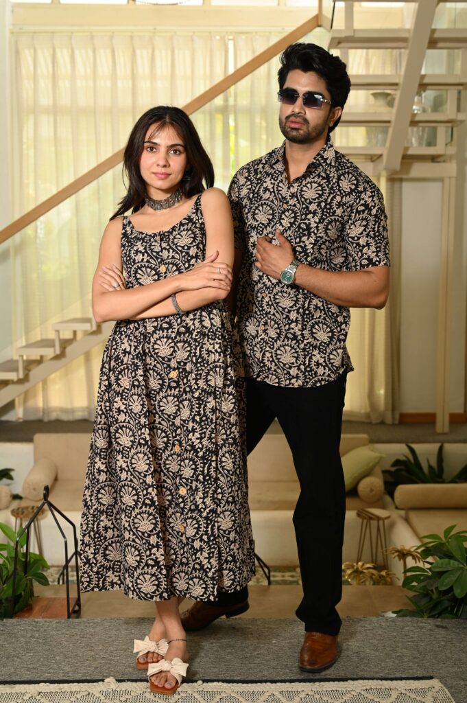 Step out in style with this charming couple matching outfit featuring a printed cotton dress for women and a coordinated short-sleeve shirt for men. Crafted from breathable cotton, this set is perfect for casual outings, vacations, parties, and pre-wedding shoots. The elegant floral-inspired print adds a touch of romance, while the soft fabric ensures all-day comfort. Pair the women?s midi dress with sandals or heels and the men?s shirt with trousers or chinos for a perfectly coordinated couple look.