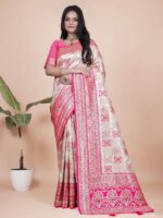 Step into royal elegance with this Cream and Pink Banarasi Silk Saree with Rich Silver Zari Weaving, designed for women who love timeless tradition with a touch of grandeur. The luxurious cream silk base is adorned with intricate silver zari block motifs, lending sophistication and heritage appeal.