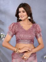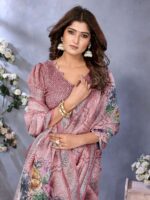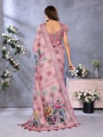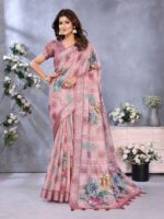 Adorn yourself in the delicate charm of this Dusty Rose Floral Printed Linen Saree. This beautiful saree is crafted from a lightweight linen fabric with a subtle shimmer that adds a touch of sophisticated elegance. The saree’s soft dusty rose hue is beautifully complemented by an intricate mix of floral prints and a delicate zigzag pattern that runs throughout, giving it a unique and modern appeal. The pallu is particularly stunning, featuring large, vibrant floral motifs that add a splash of color.