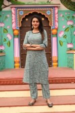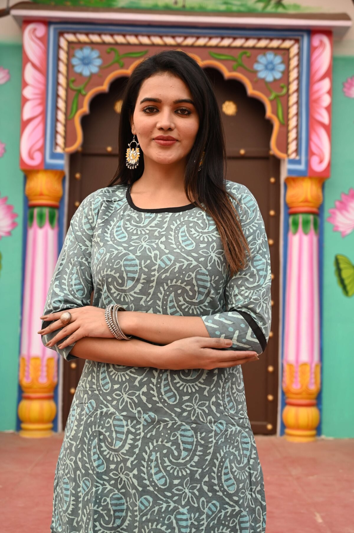 dusty teal green cotton kurta set, beautifully adorned with hand-block inspired white floral motifs. The kurta is styled with a scoop neckline enhanced with black piping and 3/4th sleeves for a refined look. The straight-fit contrast printed pants add a stylish twist, making the set perfect for both casual and semi-formal occasions. Made from lightweight, breathable cotton, this set keeps you cool and comfortable throughout the day. Whether it?s for office wear, casual outings, festive gatherings, or daily wear, this kurta set is an effortless choice.