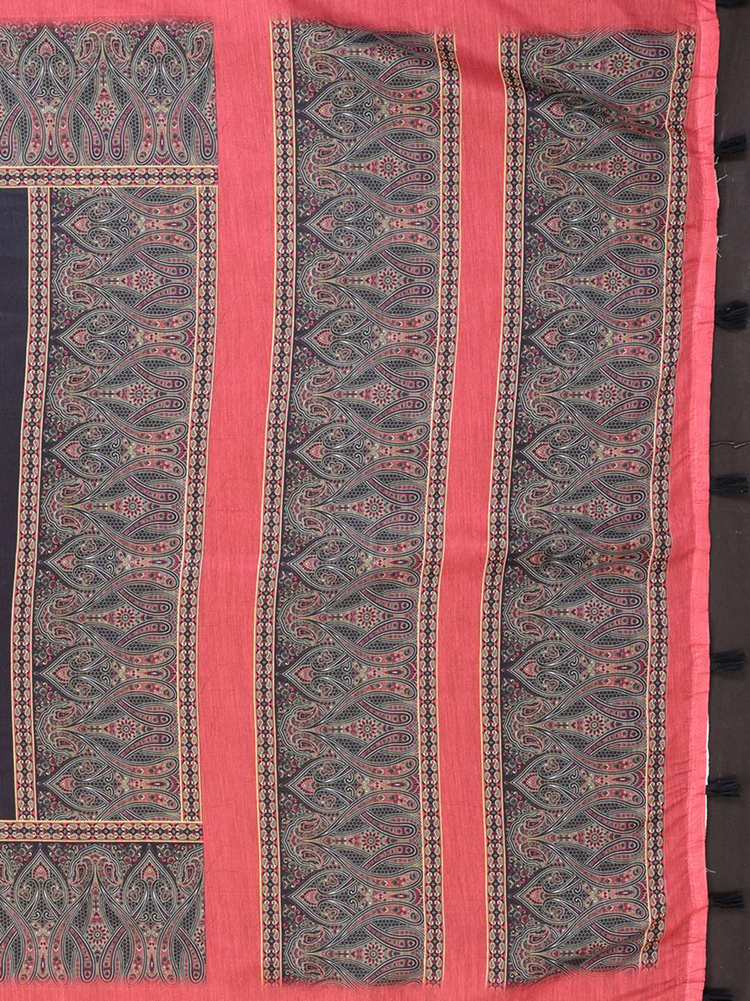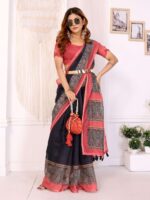 Elevate your ethnic wardrobe with the Elegant Black Chanderi Saree, crafted from soft White Chanderi fabric. The deep black base is beautifully complemented by a rich reddish-pink border, adorned with intricate traditional printed motifs that add a refined charm.