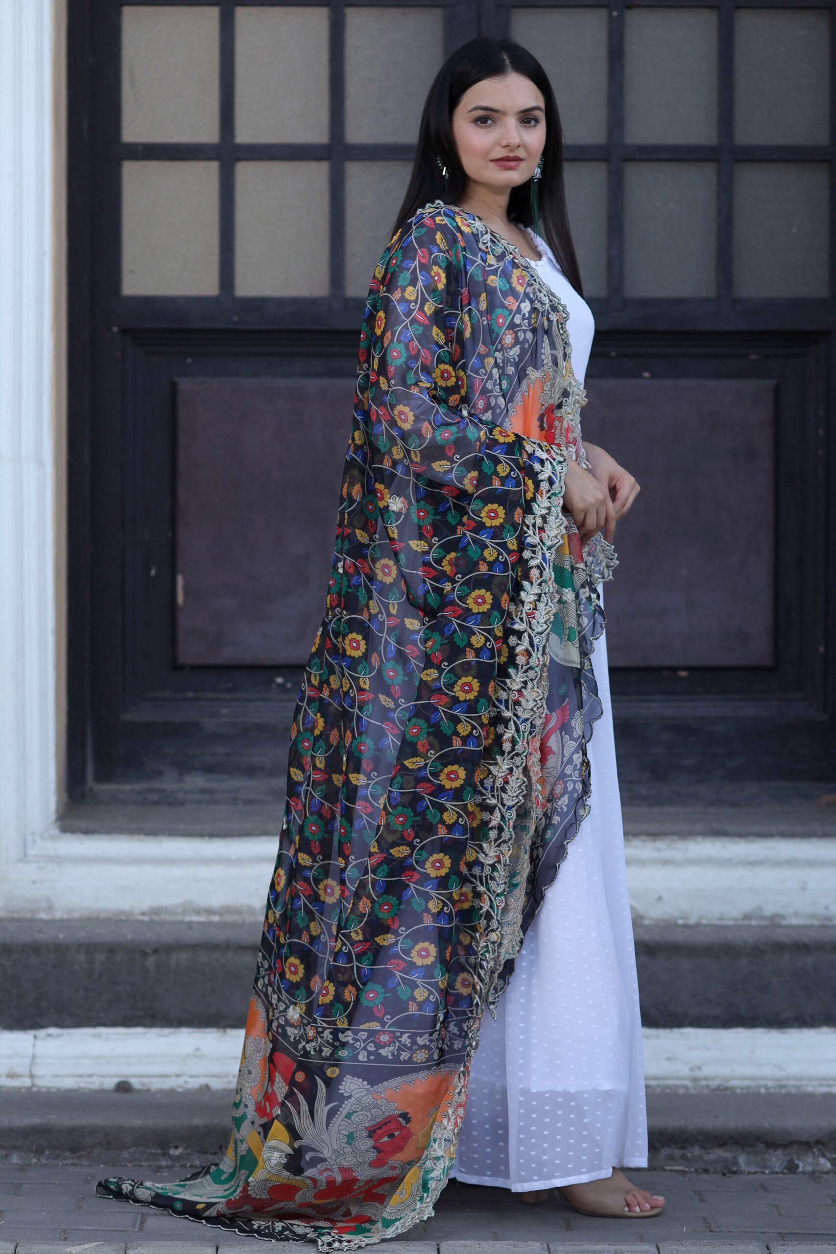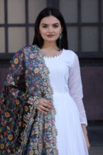 The set is complemented by a soft organza dupatta, beautifully detailed with Kalamkari digital print, Leheriya-inspired design, and fine embroidery cutwork for a sophisticated finish. Perfectly blending modern elegance with traditional charm, this gown-dupatta set is ideal for weddings, festive events, cultural functions, and special gatherings.