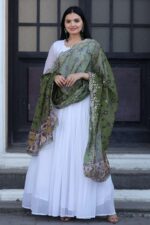 The set is complemented by a soft organza dupatta, beautifully detailed with Kalamkari digital print, Leheriya-inspired design, and fine embroidery cutwork for a sophisticated finish. Perfectly blending modern elegance with traditional charm, this gown-dupatta set is ideal for weddings, festive events, cultural functions, and special gatherings.