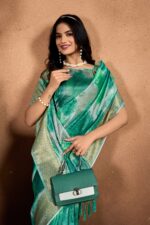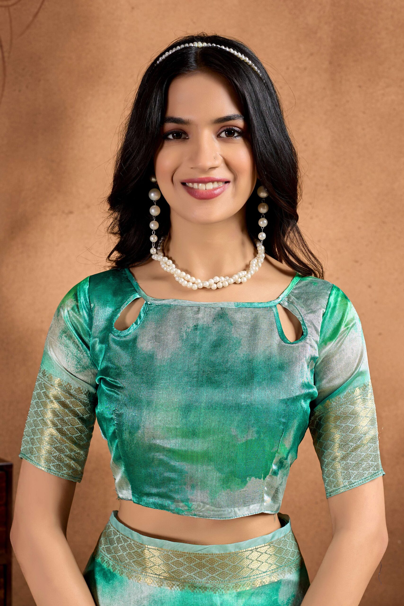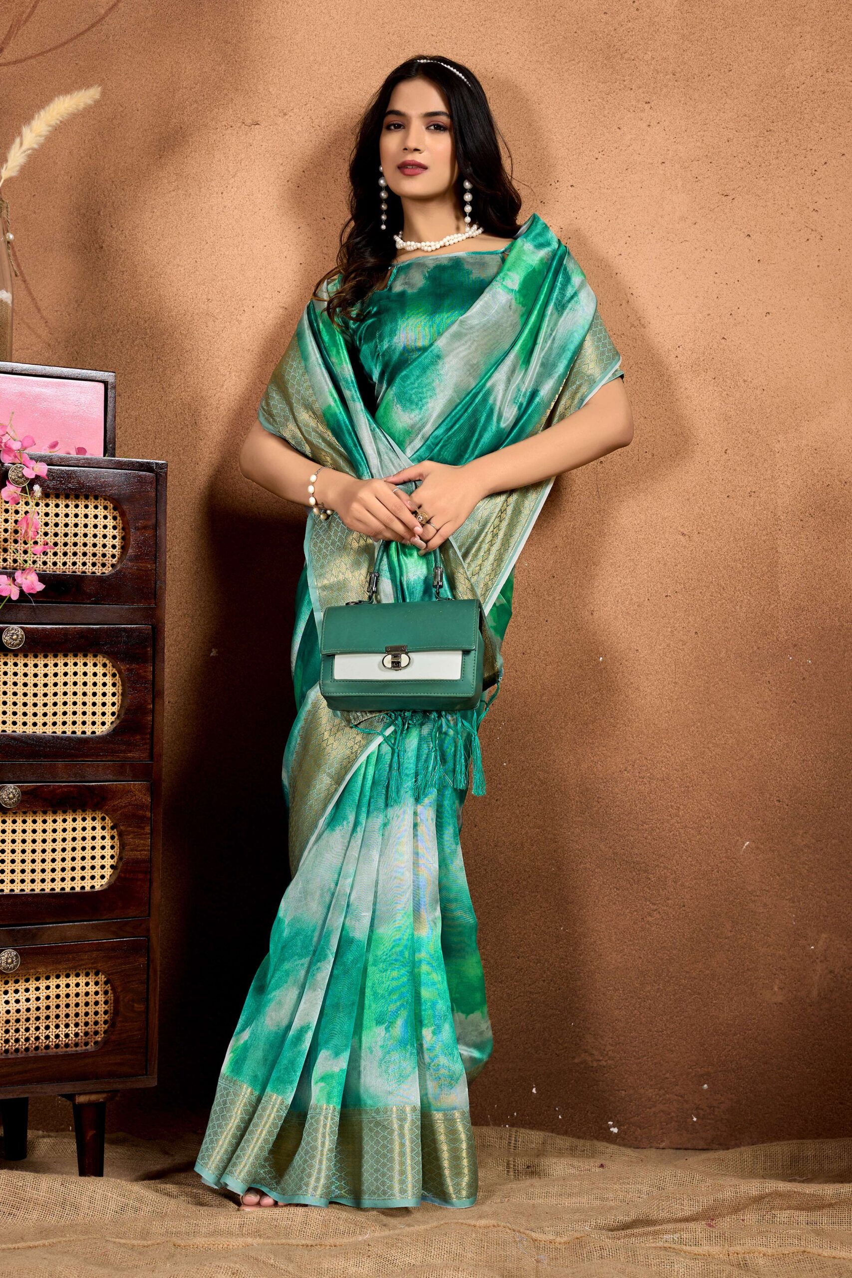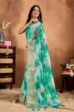 Grace meets modern art in this unique soft silk blend saree featuring a beautiful watercolor-style print in soothing green and aqua tones. The abstract cloud-like patterns flow seamlessly, offering a serene yet stylish look.