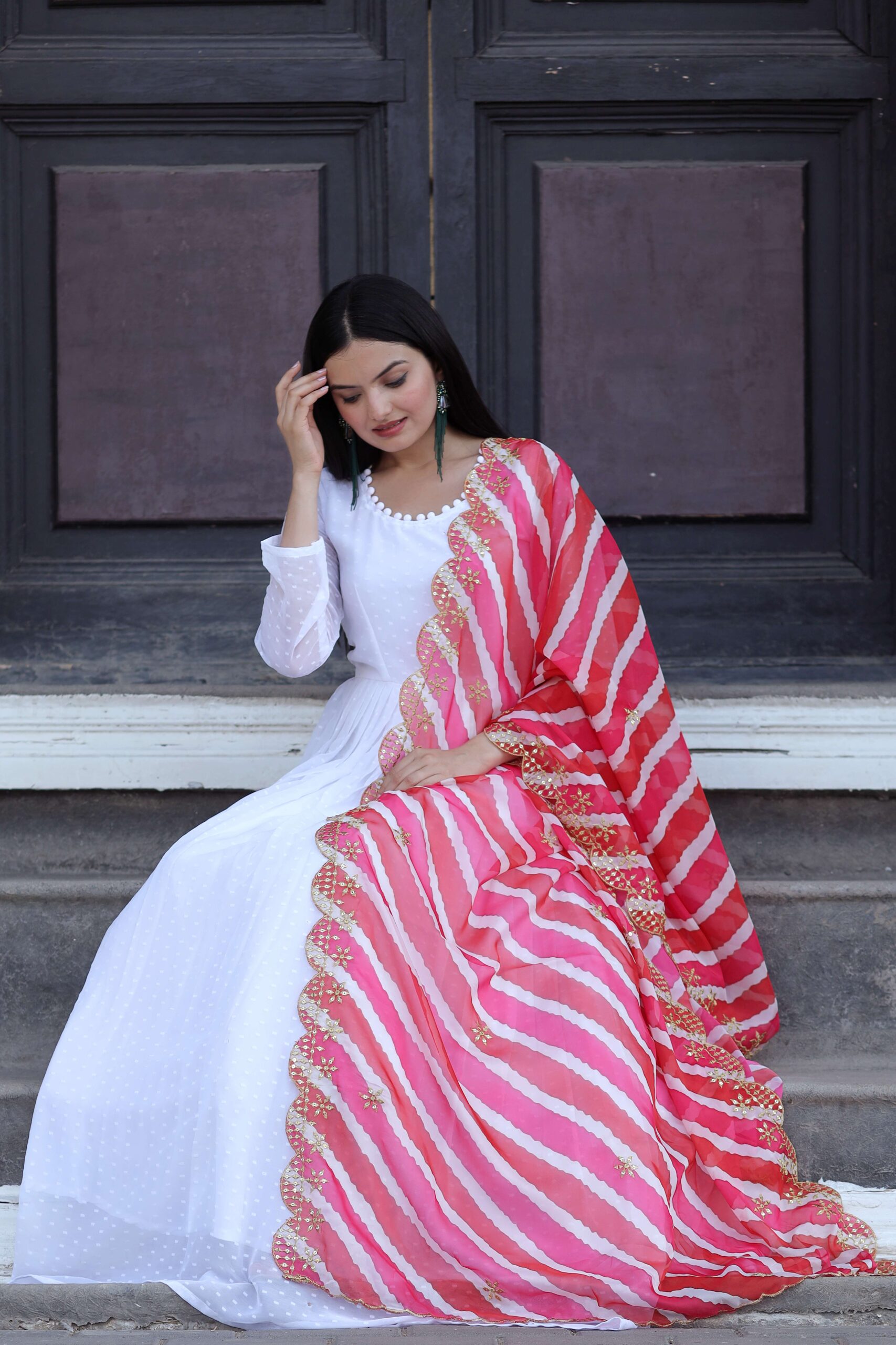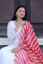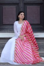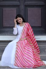 The set is complemented by a soft organza dupatta, beautifully detailed with Kalamkari digital print, Leheriya-inspired design, and fine embroidery cutwork for a sophisticated finish. Perfectly blending modern elegance with traditional charm, this gown-dupatta set is ideal for weddings, festive events, cultural functions, and special gatherings.