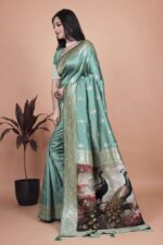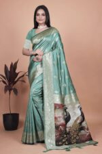 Drape yourself in timeless beauty with this Elegant Sea Green Silk Saree with Peacock Motif Pallu, a perfect balance of luxury and tradition. Crafted from rich, smooth silk blend, the saree glows with its luminous texture and intricate detailing.