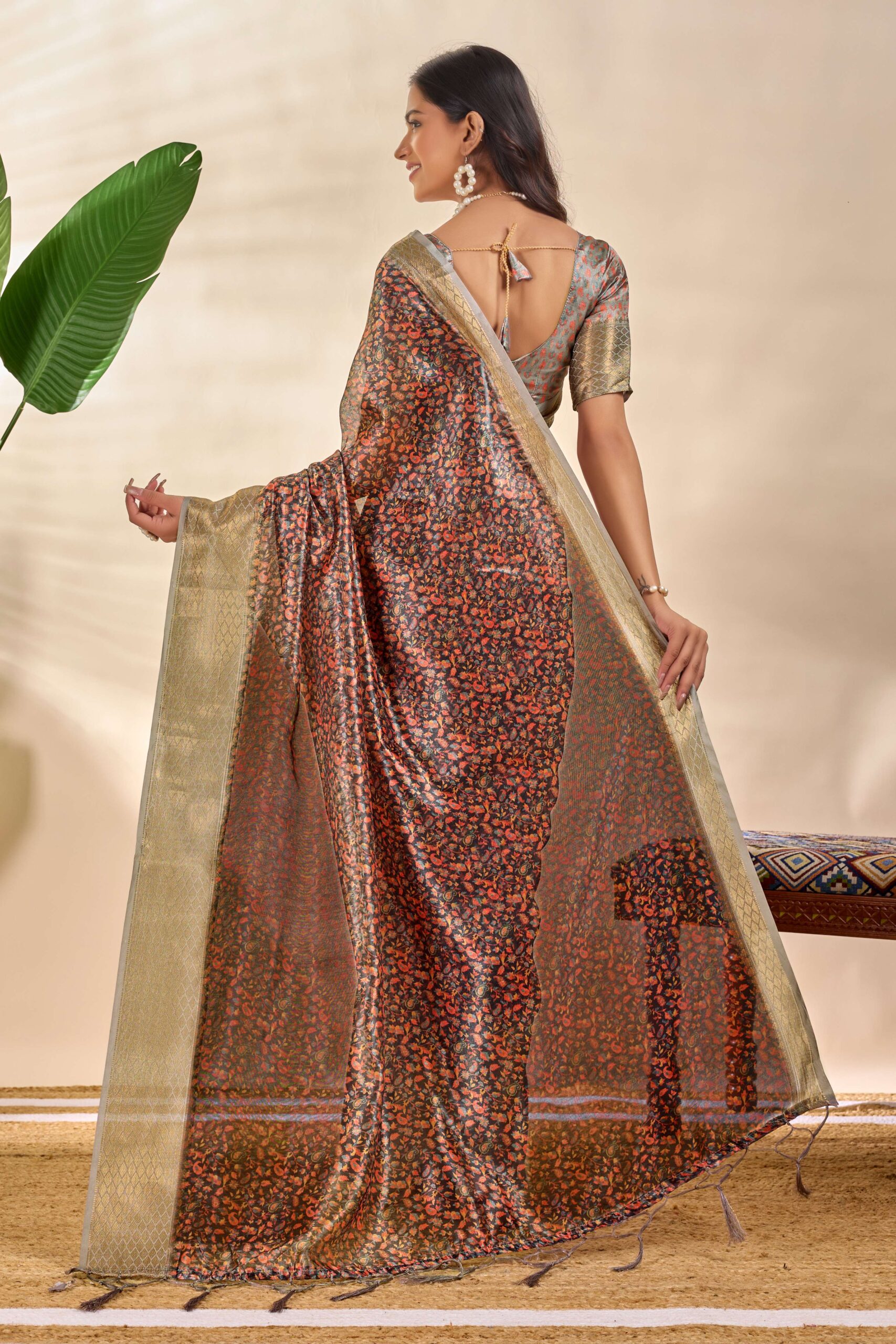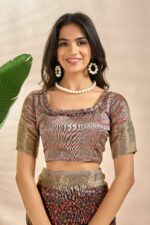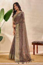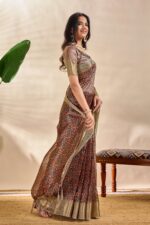 Complemented by a rich golden zari woven border, the saree drapes effortlessly, creating a regal yet graceful silhouette. A matching blouse piece enhances the elegance, making it a complete ensemble for special occasions.
