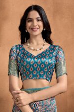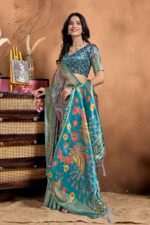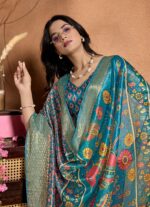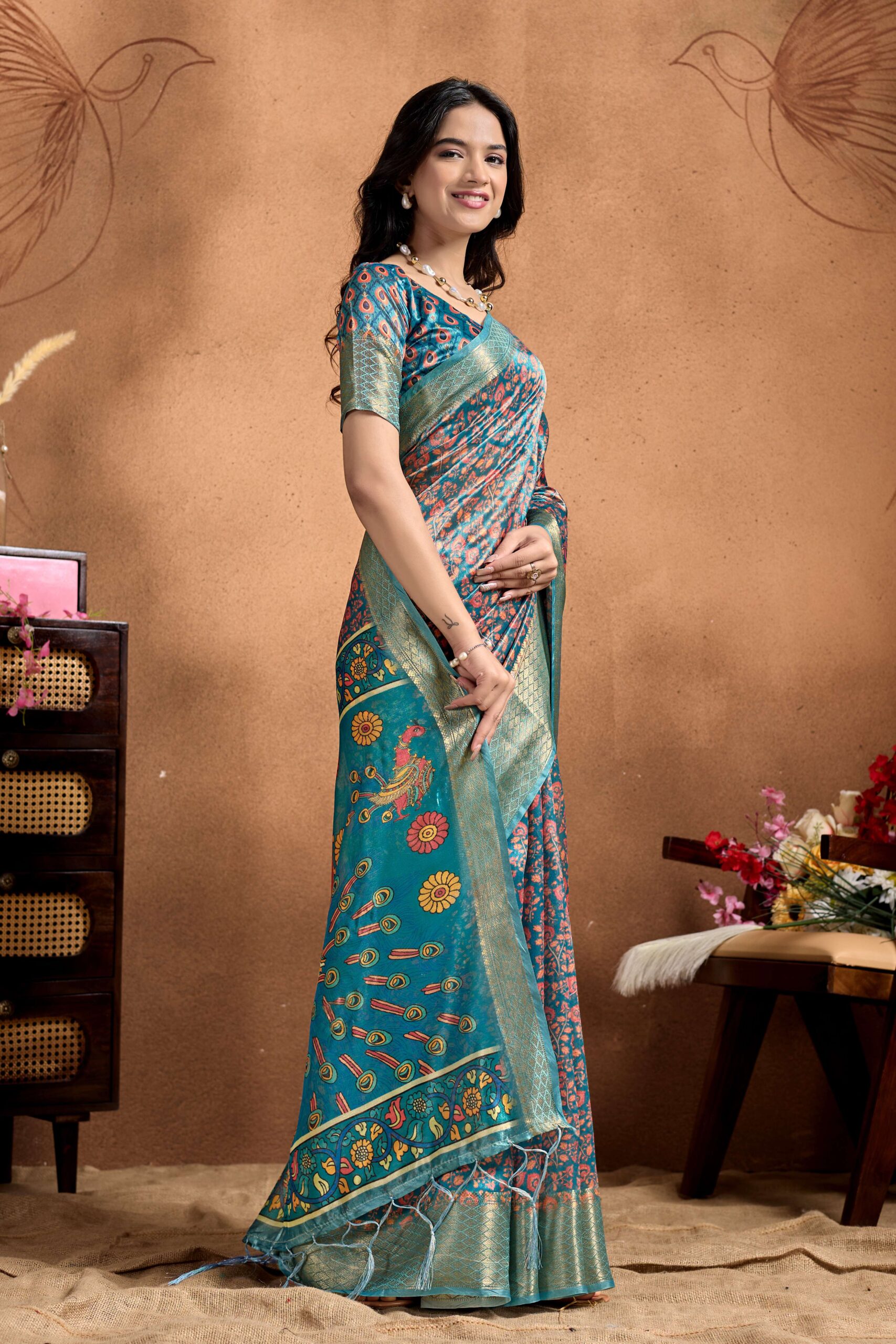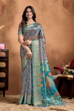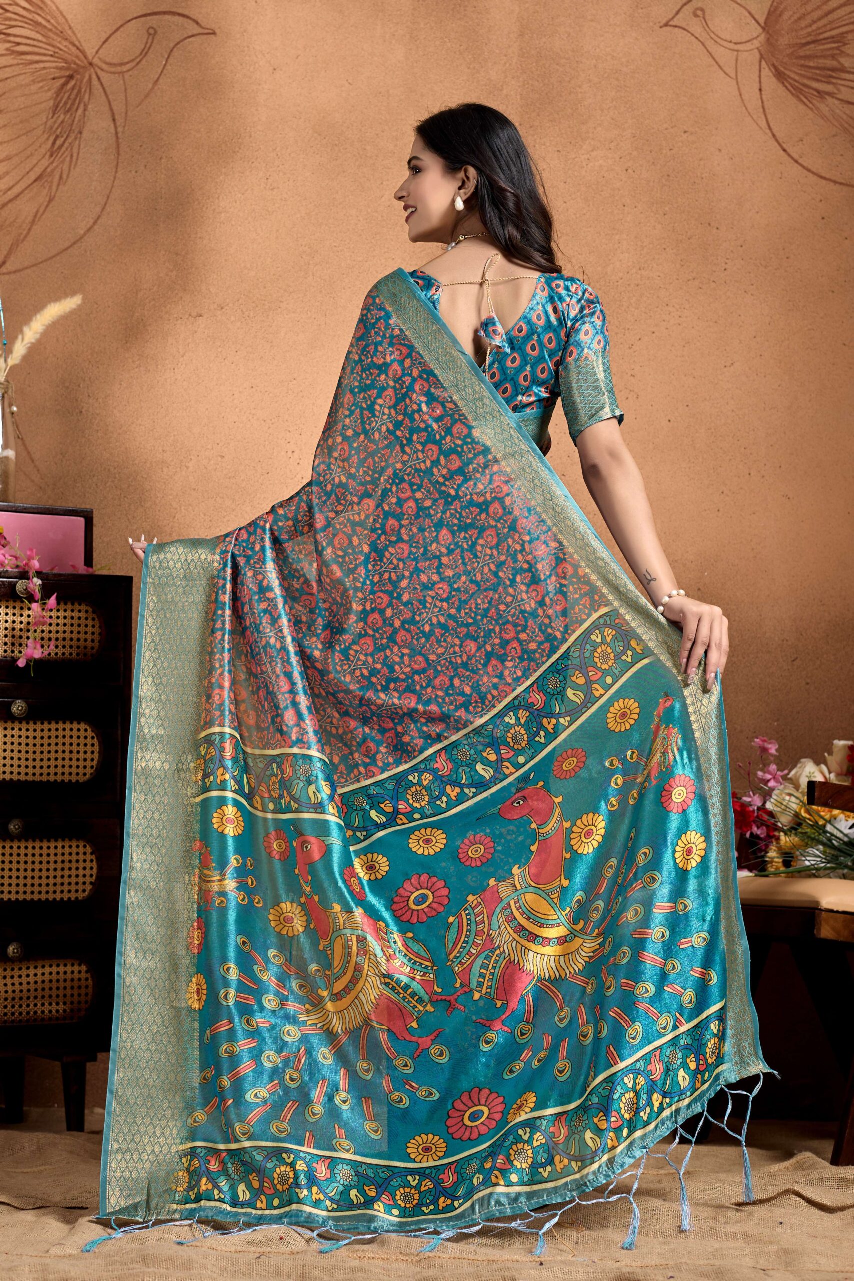Add a royal flair to your ethnic wardrobe with this stunning soft silk saree, gracefully adorned with floral motifs and a majestic peacock pallu. The vibrant contrast between the teal base and the multicolor print brings out a rich cultural essence that?s perfect for festive and ceremonial wear.