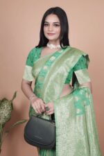 Step into timeless elegance with this Emerald Green Banarasi Silk Saree with Golden Zari Butti and Rich Pallu. Crafted from luxurious Banarasi silk, the saree features all-over golden zari butti motifs in teardrop and floral patterns, enclosed with delicate vine detailing, reflecting the finesse of traditional weaving.