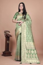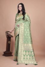 Emerald Green Banarasi Silk Saree with Silver Zari | Geometric & Floral Design | Wedding, Festive & Traditional Wear