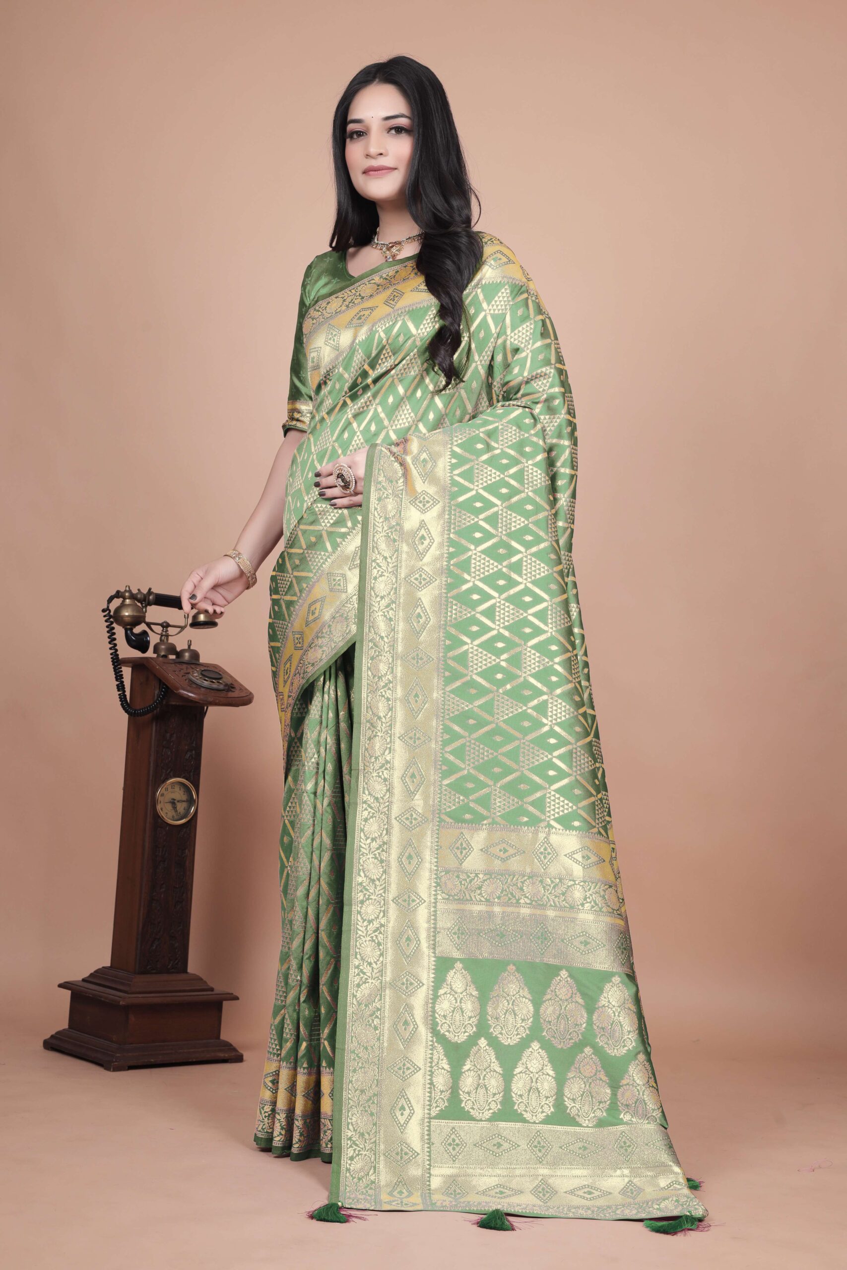 Embrace sophistication with this Emerald Green Banarasi Silk Saree with Silver Zari Detailing. The saree?s body is adorned with intricate geometric patterns in diamond and triangle shapes, while the lavish pallu showcases traditional floral motifs, reflecting the elegance of Indian craftsmanship.