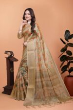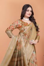 Unveil your timeless beauty in this golden beige soft silk saree, beautifully designed with subtle autumn leaf patterns in warm rust, green, and copper tones. The smooth silk texture combined with the elegant zari detailing makes it a perfect blend of style and tradition.