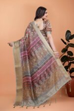 Celebrate the spirit of tradition with this elegant golden beige soft silk saree, adorned with a vibrant mix of red, brown, and green geometric designs. The rich texture and intricate weave offer a luxurious touch to your ethnic wardrobe.