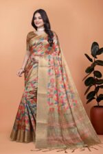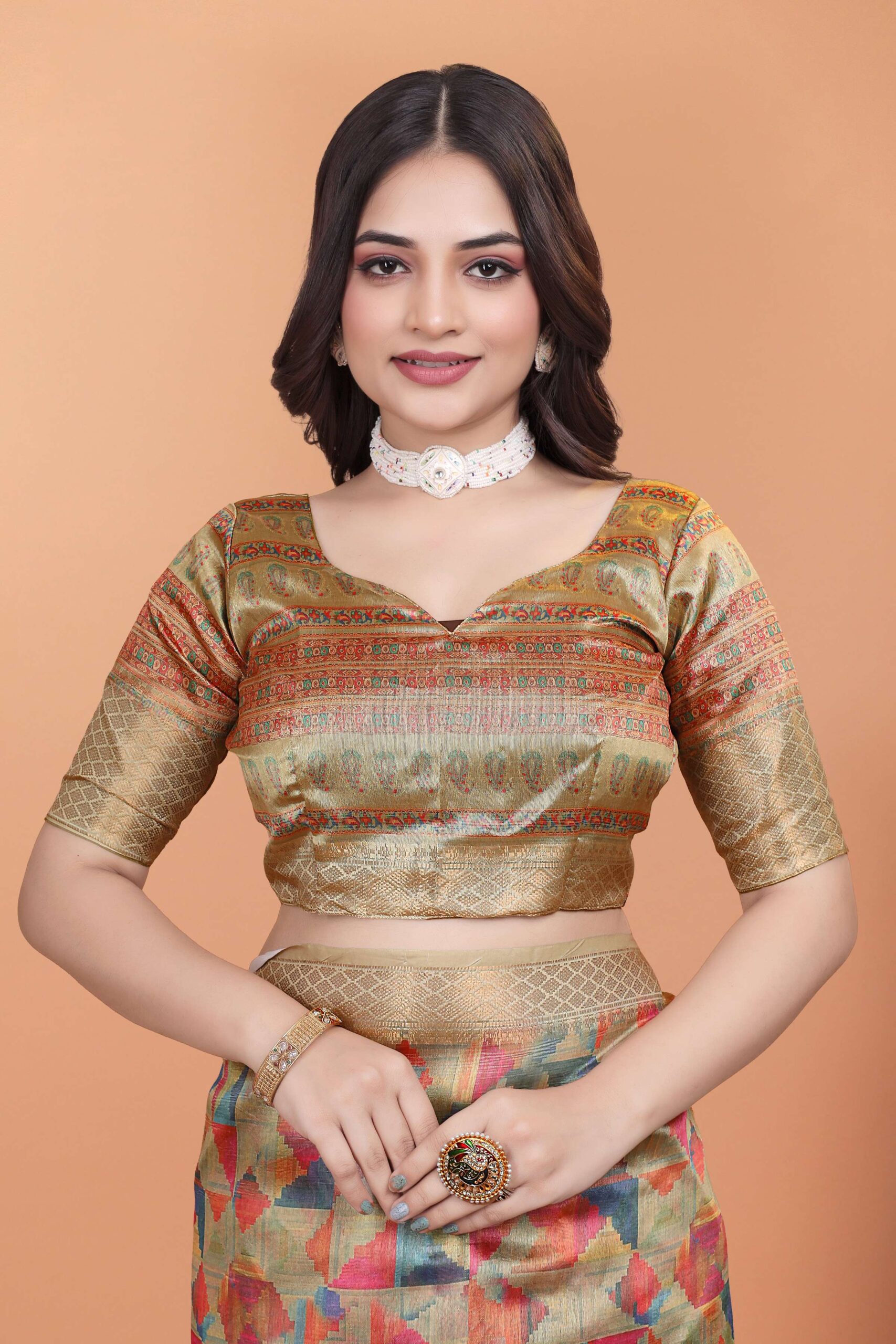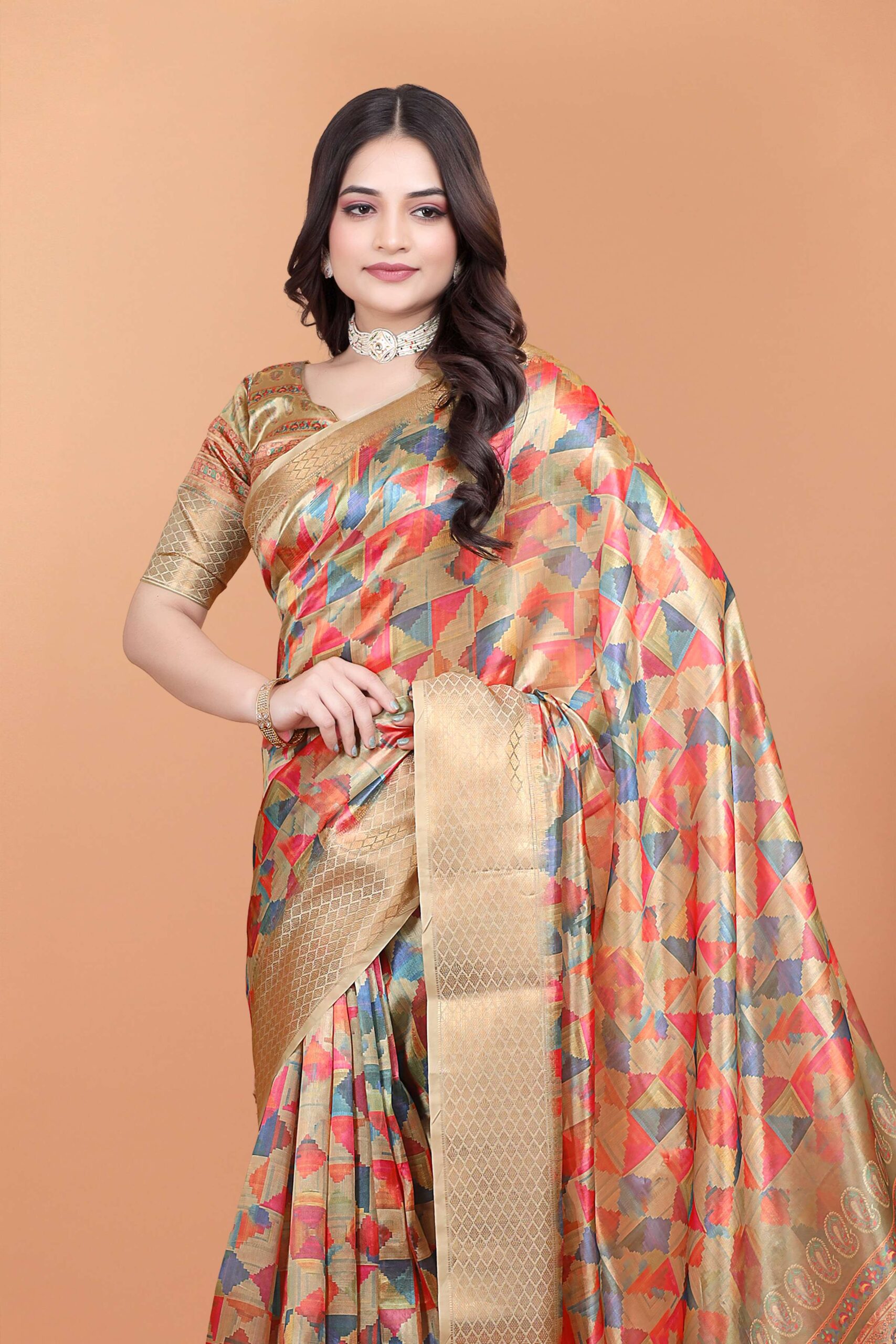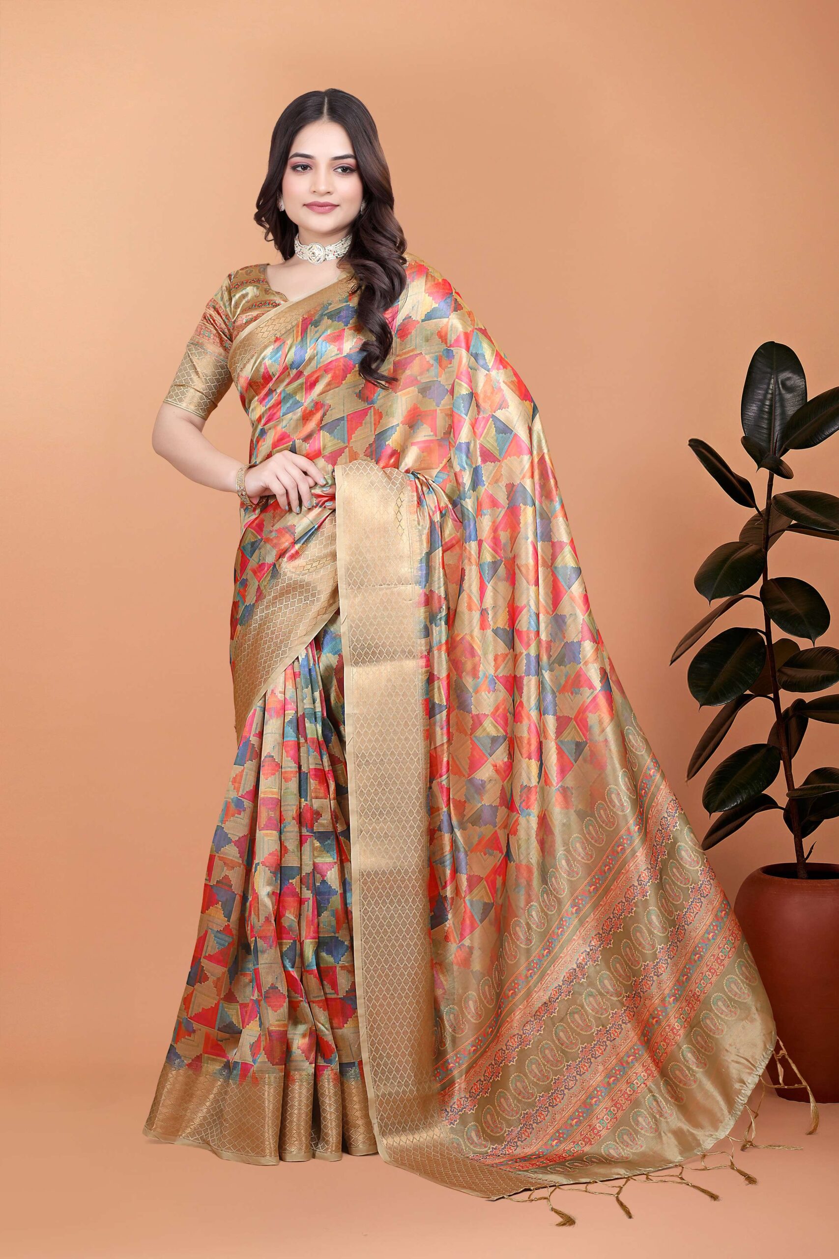 Step into timeless elegance with this rich golden soft silk saree adorned with multicolor geometric patterns. The vivid color palette on a soft golden base creates a mesmerizing fusion of tradition and modern design.
