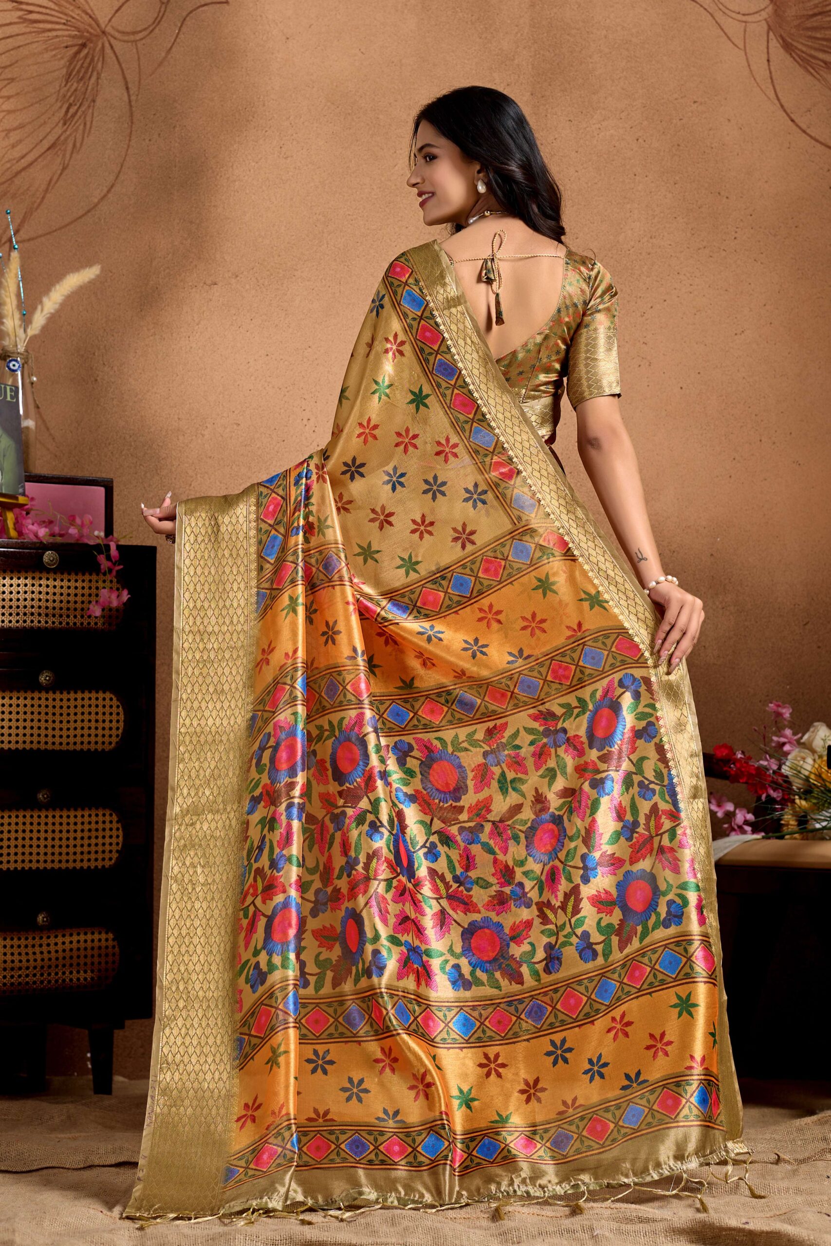 An exquisite blend of elegance and vibrance, this golden soft silk blend saree is adorned with intricate multicolor floral and star motifs. The rich design features a striking contrast pallu with bold floral patterns and geometric detailing, making it a perfect choice for festive and traditional celebrations.