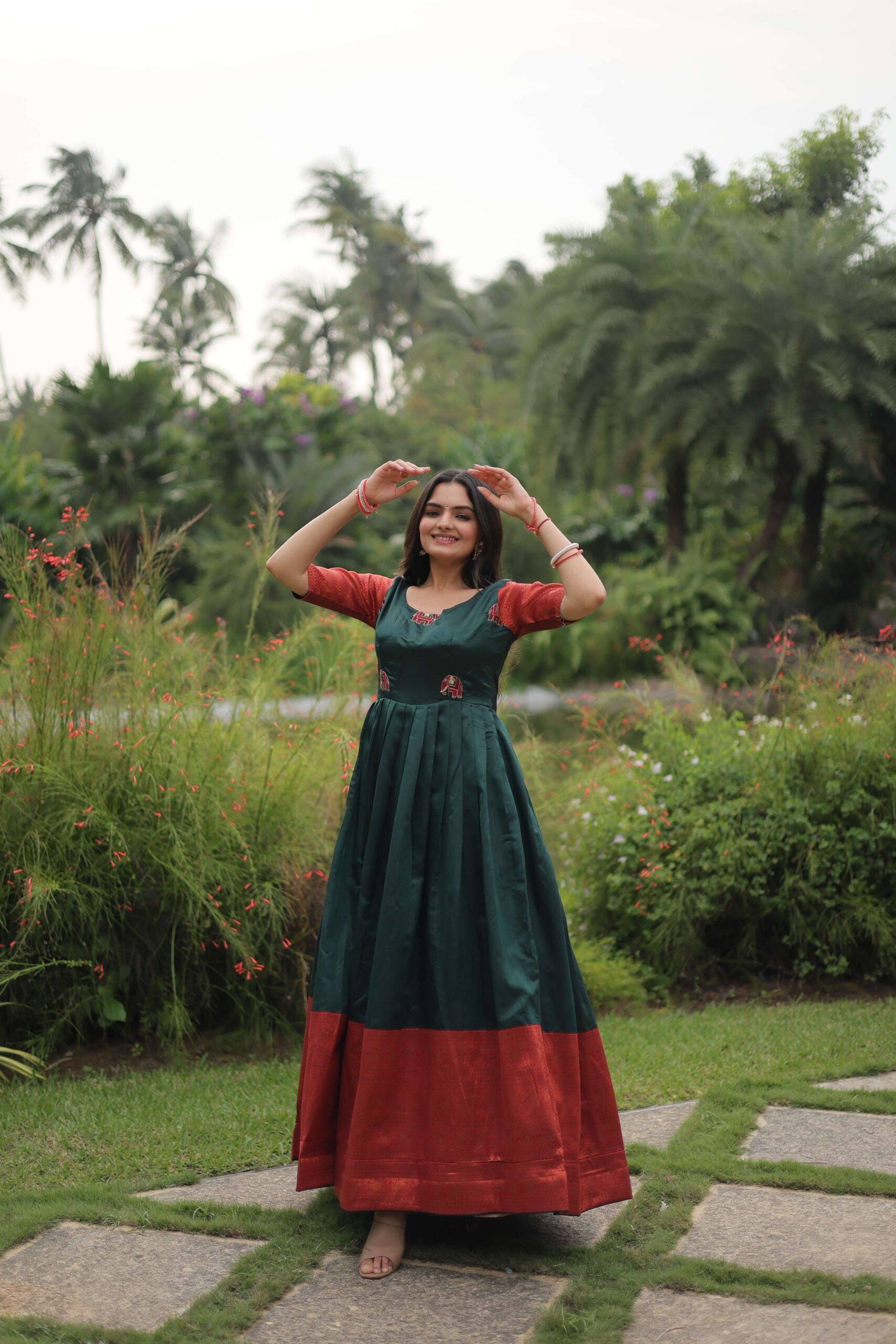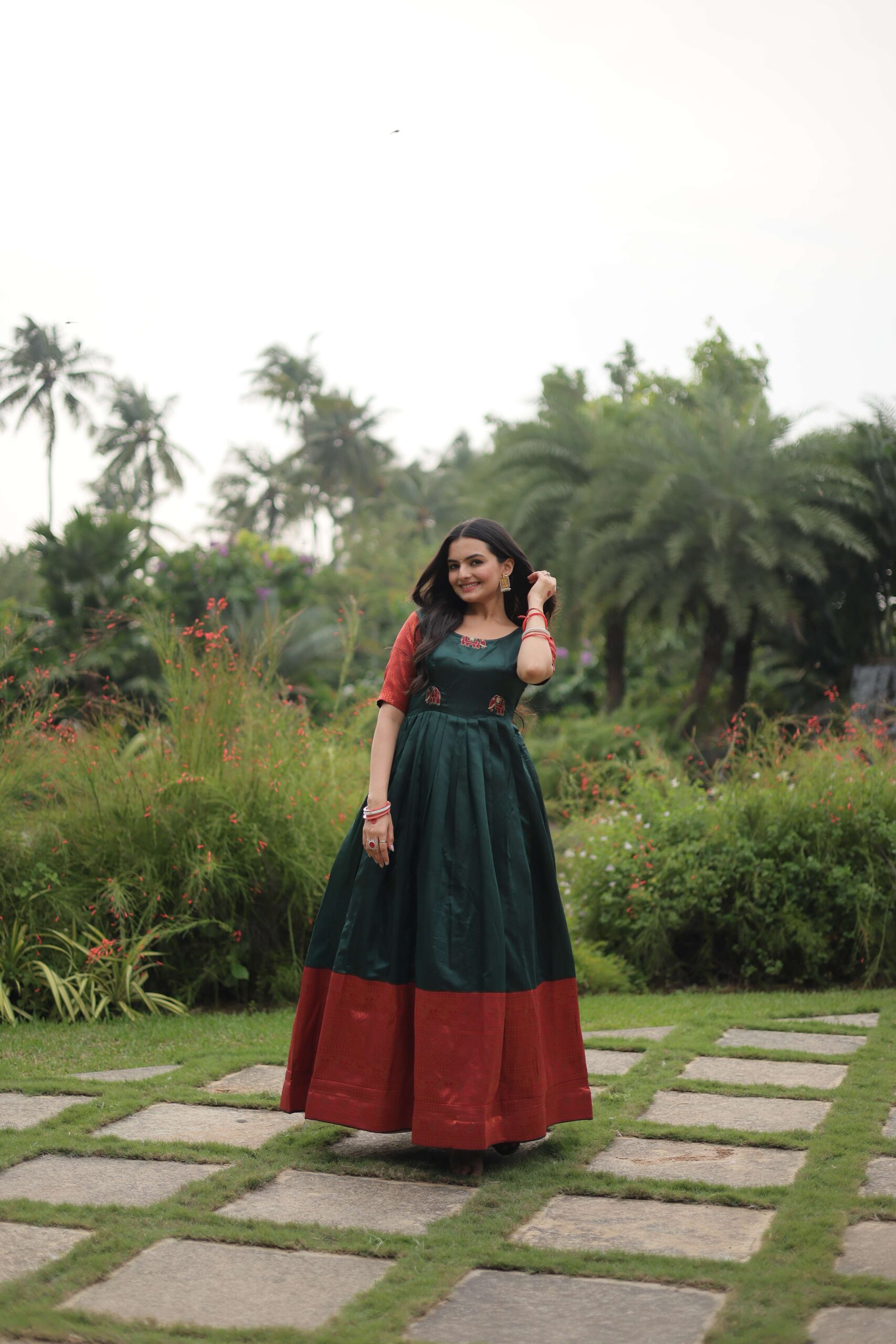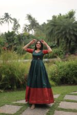The gown offers half sleeves, a graceful round neckline, a 3.5-meter flowing flare, and a soft cotton full-length inner lining for all-day comfort. Ideal for weddings, festive occasions, and formal events, this designer gown effortlessly combines traditional charm with contemporary style.