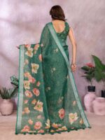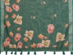 Elevate your ethnic wardrobe with the Green Floral Linen Shimmer Saree. Crafted from premium linen shimmer fabric, this saree features a refreshing green base adorned with soft pastel floral prints in peach and cream tones. The subtle shimmer adds a refined elegance, making it a classy choice for festive celebrations, weddings, and cultural gatherings.