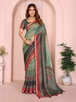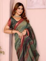 Step into timeless elegance with this Green & Maroon Black Chanderi Saree. Crafted in soft, breathable Chanderi fabric, it features a calming green base adorned with tribal-inspired motifs and geometric prints in black and maroon.