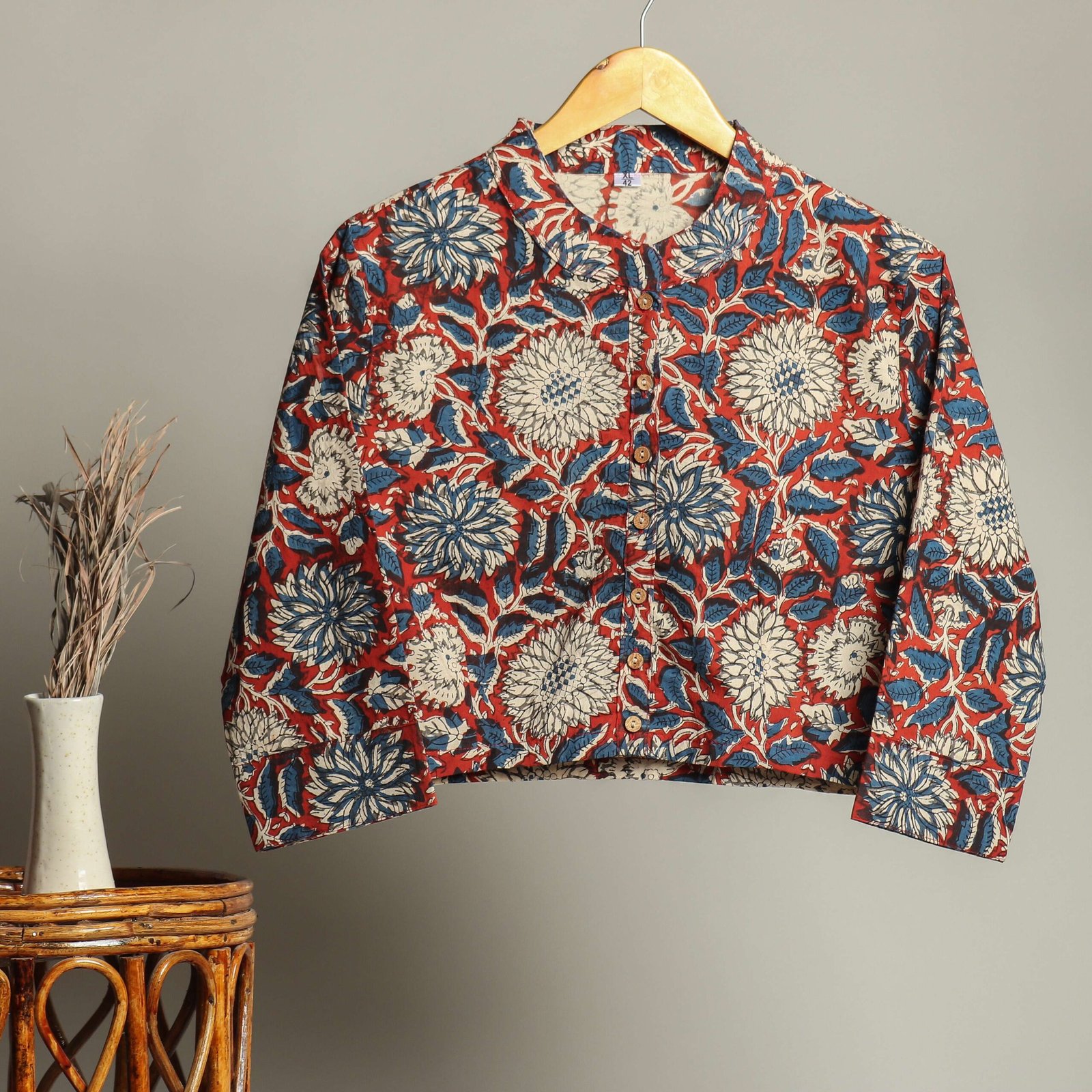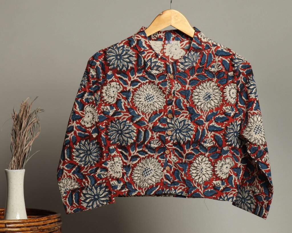 elegance of handcrafted fashion with this hand block printed cotton shirt blouse. Featuring bold floral motifs in red, blue, and beige tones, this top is a perfect blend of traditional artistry and modern style. The button-down front with a smart round collar makes it versatile for both casual and semi-formal looks.