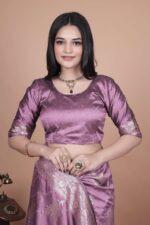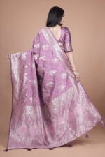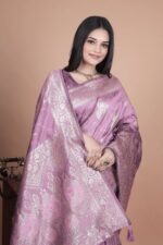 Step into timeless sophistication with this Lavender Banarasi Silk Saree with Silver Zari Weaving. Crafted from premium Banarasi silk, the saree features meticulously woven silver zari motifs in classic floral and paisley designs, radiating regal charm.