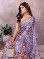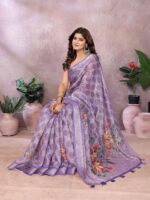 Elevate your ethnic wardrobe with the Lavender Floral Linen Shimmer Saree. Crafted from premium linen shimmer fabric, this saree features a soft lavender base adorned with intricate floral prints, giving it a sophisticated and feminine charm. The plain shimmering border adds a subtle elegance, perfectly balancing traditional and contemporary appeal.