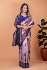 Step into elegance with this Lavender & Royal Blue Banarasi Silk Saree, where grace meets grandeur. The lavender silk body is adorned with intricate antique gold zari embroidery, highlighting traditional floral and cultural motifs that radiate sophistication.