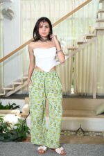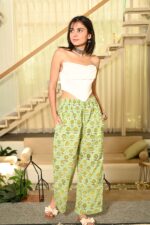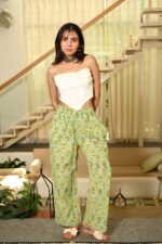 Light green cotton printed straight pants for women. Designed with a relaxed fit and an elasticated waistband, these pants promise effortless comfort along with a trendy look. The charming yellow floral tree motifs against a soothing green base create a lively, youthful vibe. Whether you pair them with a kurta for a casual ethnic look or style them with a chic crop top for a modern twist, these versatile bottoms are a must-have in your collection.