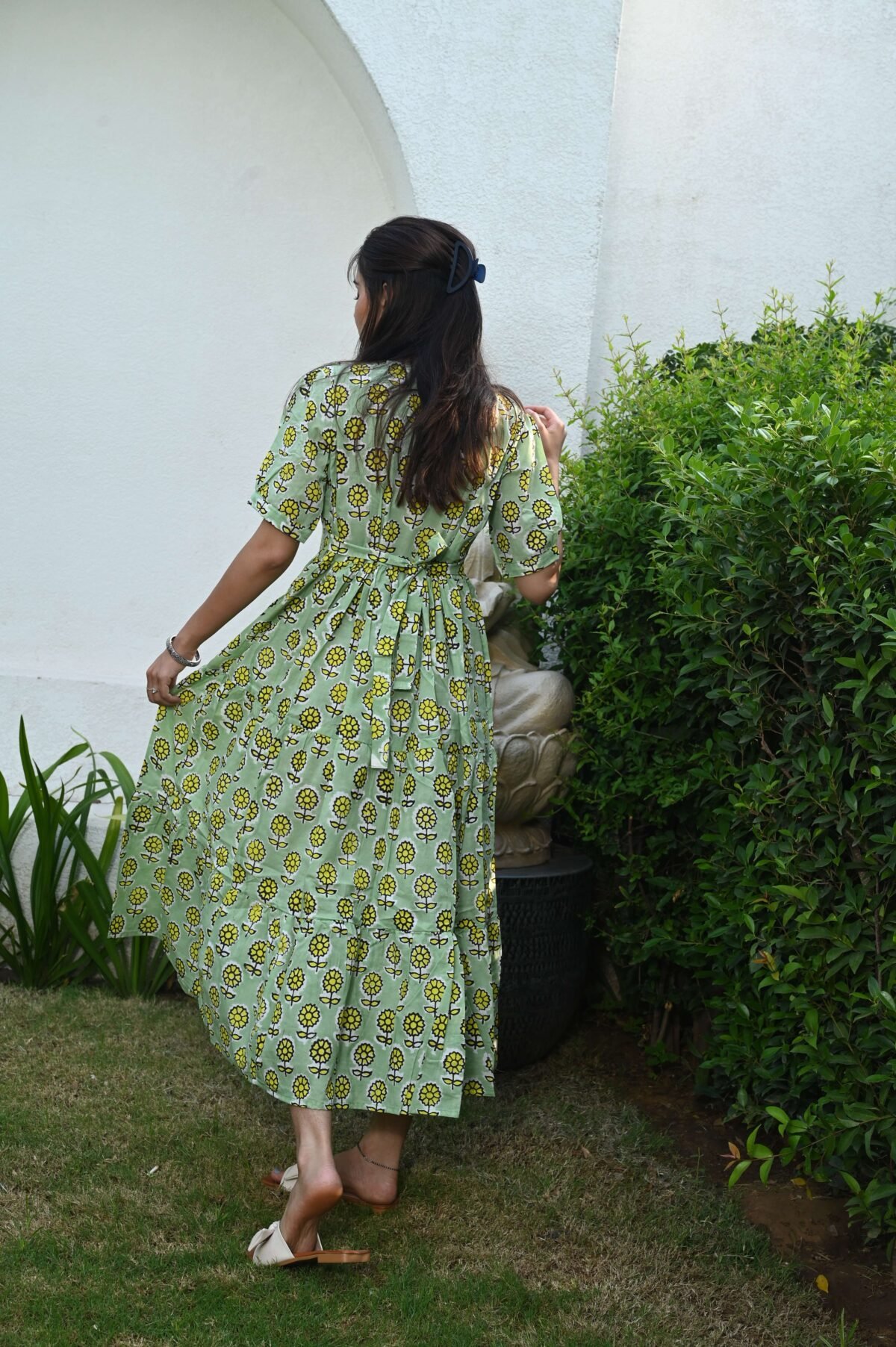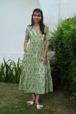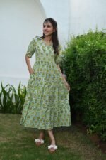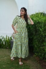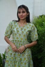 Elevate your everyday look with this Light Green Floral Printed Cotton Anarkali Maxi Dress, designed to blend comfort with chic style. Crafted from breathable cotton fabric, this dress features a beautiful all-over floral pattern that adds a touch of charm and femininity. The V-neckline and puff sleeves give it a trendy silhouette, while the flared tiered hemline ensures graceful movement with every step.