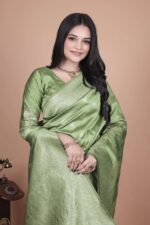 Add a touch of festive charm to your ethnic wardrobe with this Lime Green Banarasi Silk Saree with Intricate Zari Peacock Motifs. The saree features premium Banarasi silk fabric intricately woven with golden zari work, highlighting elegant peacock and paisley motifs throughout the body.