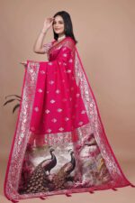 Celebrate tradition and artistry with this Majestic Magenta Silk Saree with Peacock Pallu, a true statement of elegance and grandeur. Crafted from luxurious silk blend, the saree features a soft, glossy texture that drapes beautifully, making it ideal for special occasions.