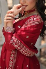 The look is completed with a matching dupatta designed in Faux Blooming fabric, highlighted with sequins embroidery and elegant arco-cut detailing, making it an eye-catching ensemble that embodies charm and sophistication.