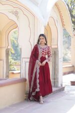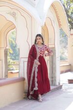 The gown features a fancy round neck, full sleeves, and a 12-meter flowing flair with frill stitching, ensuring a graceful silhouette for all body types. A soft cotton full-length lining provides comfort, while the matching Faux Blooming dupatta with sequins embroidered cutwork adds a sophisticated finishing touch.