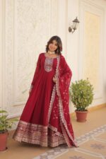 Elevate your festive wardrobe with this premium Faux Georgette gown-dupatta set. The gown is crafted from high-quality faux georgette fabric with elegant sequins embroidery, a designer V-neck, full sleeves, and a dramatic 15-meter flair enhanced with 5-layer frill stitching. A soft cotton full-length inner lining ensures comfort while maintaining a perfect silhouette.