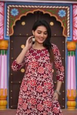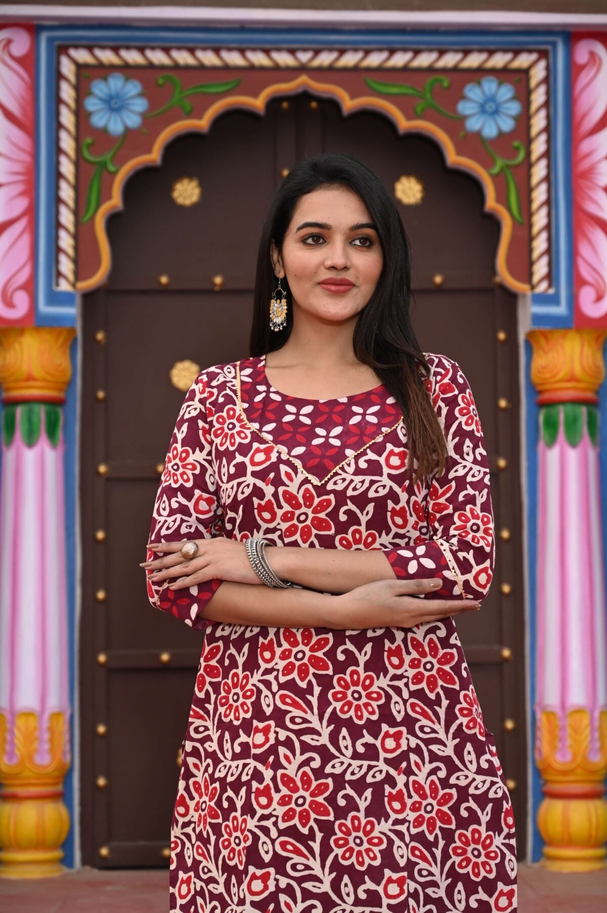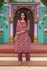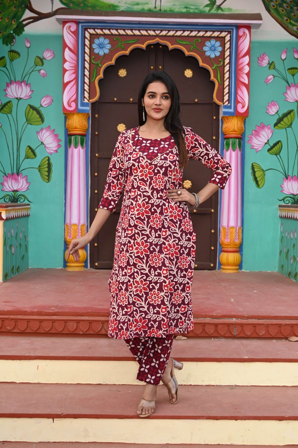 maroon floral print cotton kurta set, featuring a graceful floral pattern that exudes traditional charm with a modern touch. The kurta is tailored with a straight fit, round neckline, and 3/4th sleeves, ensuring both comfort and elegance.