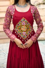 Maroon Navratri Special 14 Kg Reyon Designer Gown with Kutchi Gamthi & Cotton Print Work