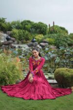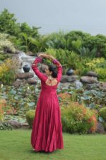 Celebrate Navratri in style with this exquisite maroon gown, crafted from high-quality Reyon fabric and adorned with traditional Kutchi Gamthi embroidery. Designed with a 4-layer frill hem and a flowing 10-meter+ flair, this gown creates a graceful silhouette that moves beautifully with every step.