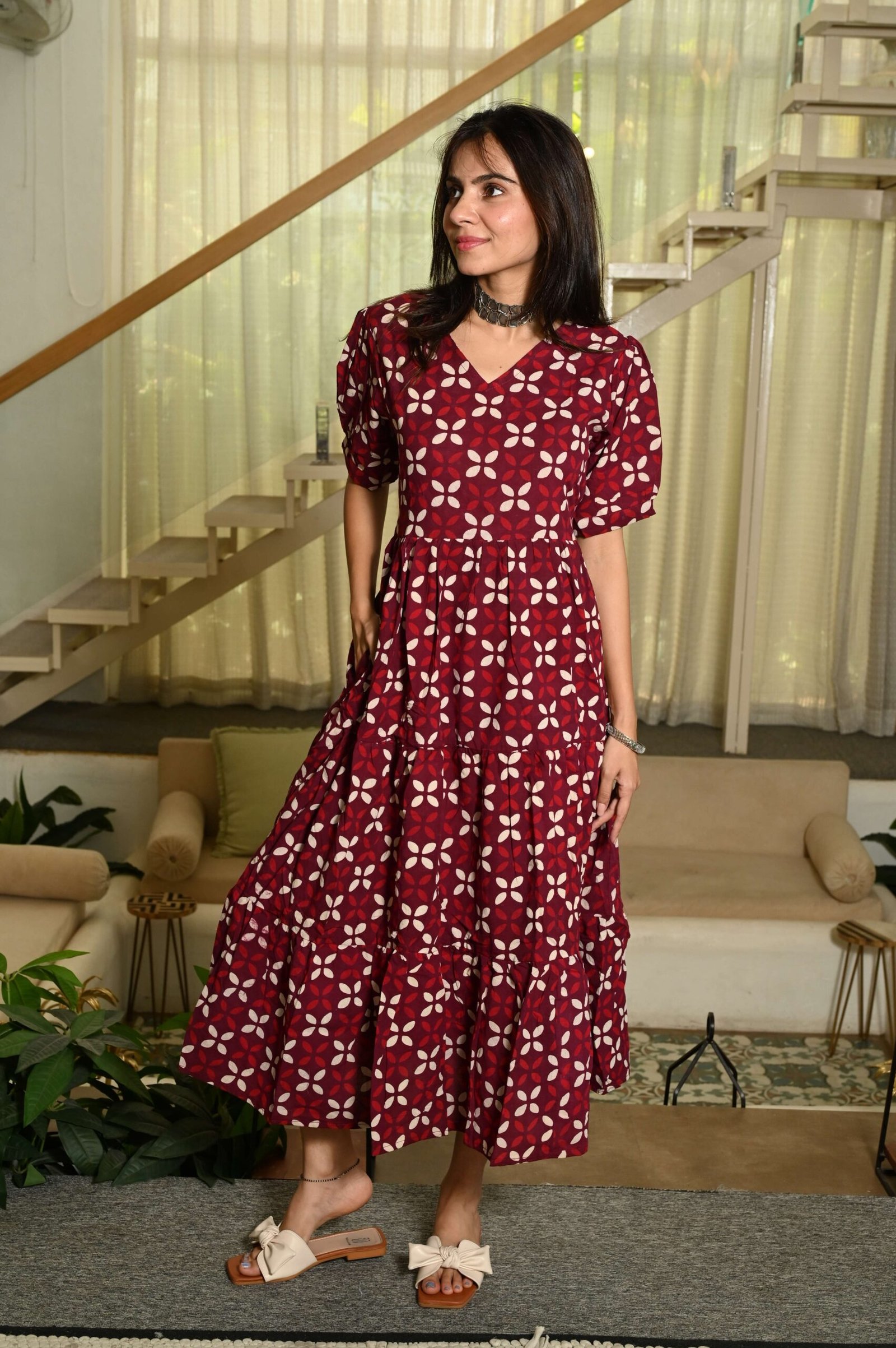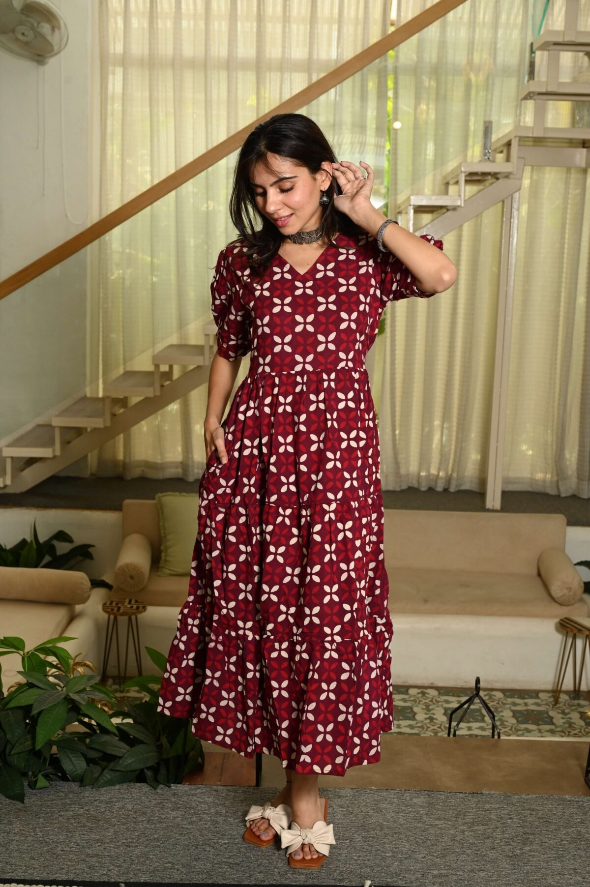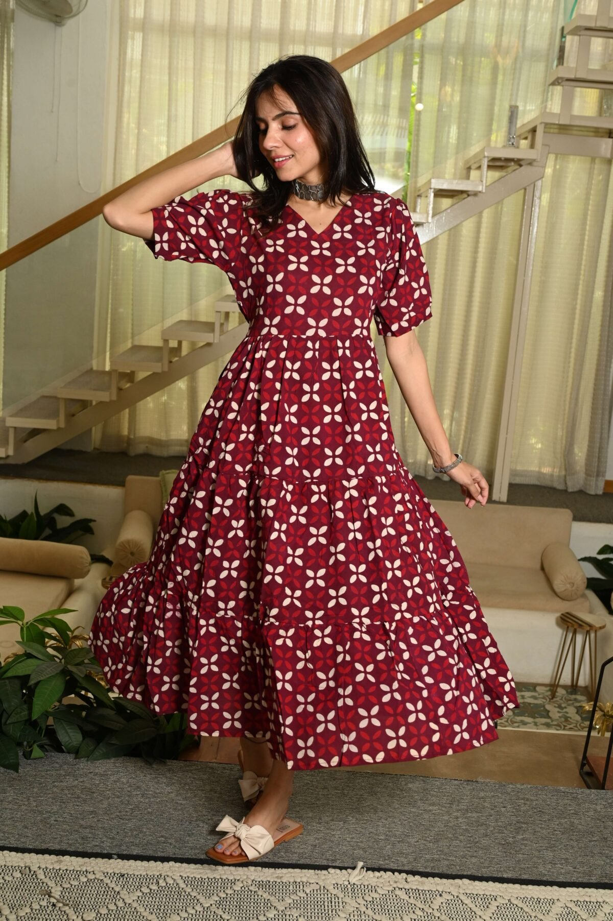 Maroon Printed Cotton Anarkali Maxi Dress with Puff Sleeves Elegant Casual Wear