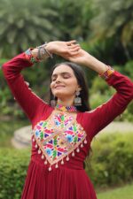 Designed with a fancy front and back neckline, it combines modern aesthetics with traditional charm. The full-length cotton lining ensures comfort throughout the evening, while the 56-inch length provides a graceful silhouette. Ideal for Garba, Dandiya nights, and festive parties, this gown promises to make you the center of attention with effortless elegance.
