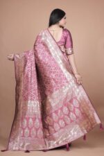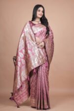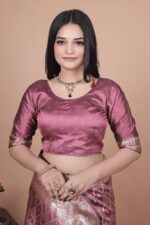 Add a touch of refined elegance to your wardrobe with this Mauve Banarasi Silk Saree with Silver Geometric and Floral Zari Work. The body of the saree is adorned with striking geometric silver zari patterns, offering a modern edge while staying rooted in tradition.