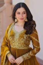 The 56-inch gown features full sleeves, a fancy V-neck, and a 3.5-meter flair for a graceful flow. Accompanied by a 2.3-meter dupatta with matching rich embroidery, this ensemble perfectly combines Indian ethnic charm with modern partywear style.