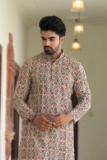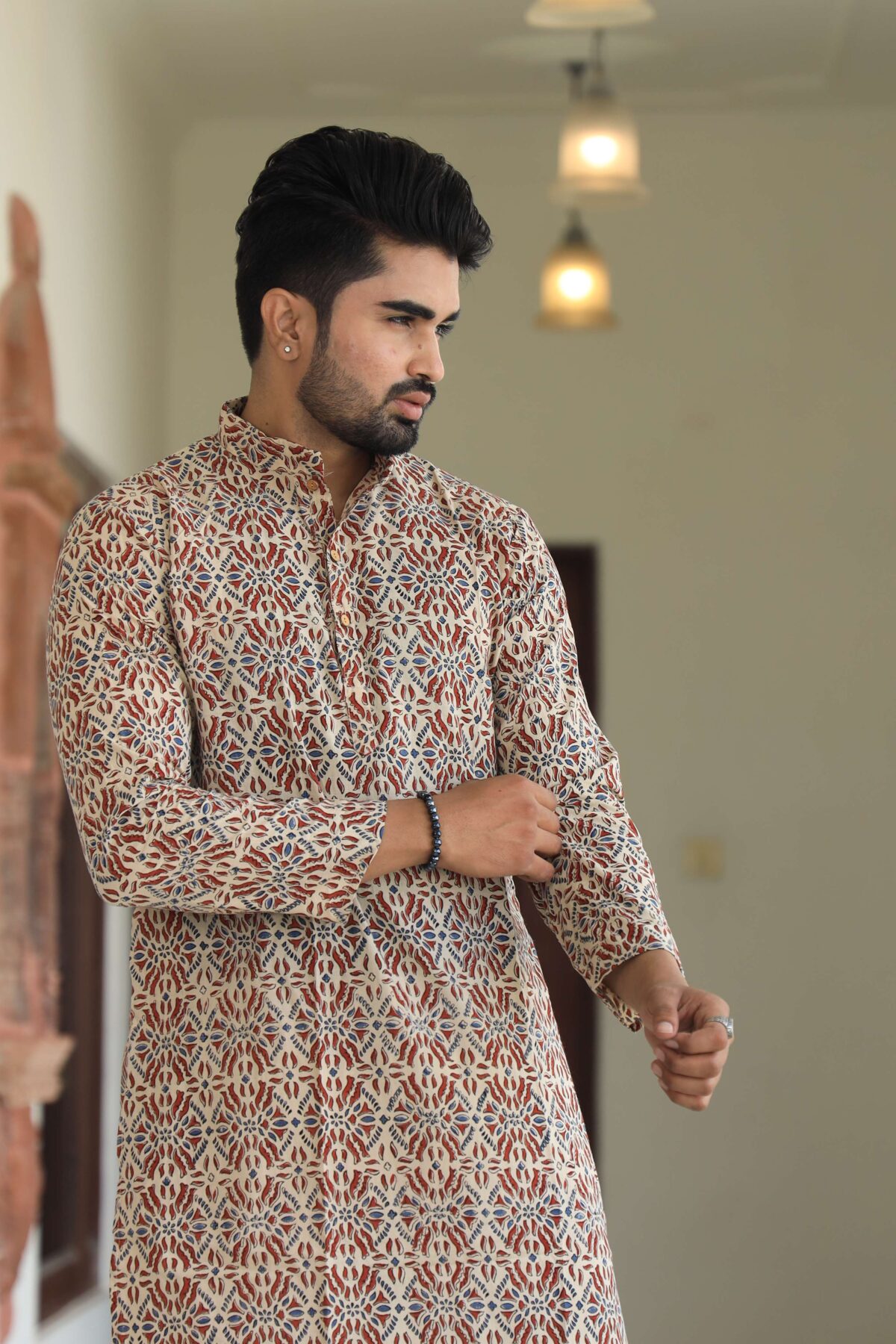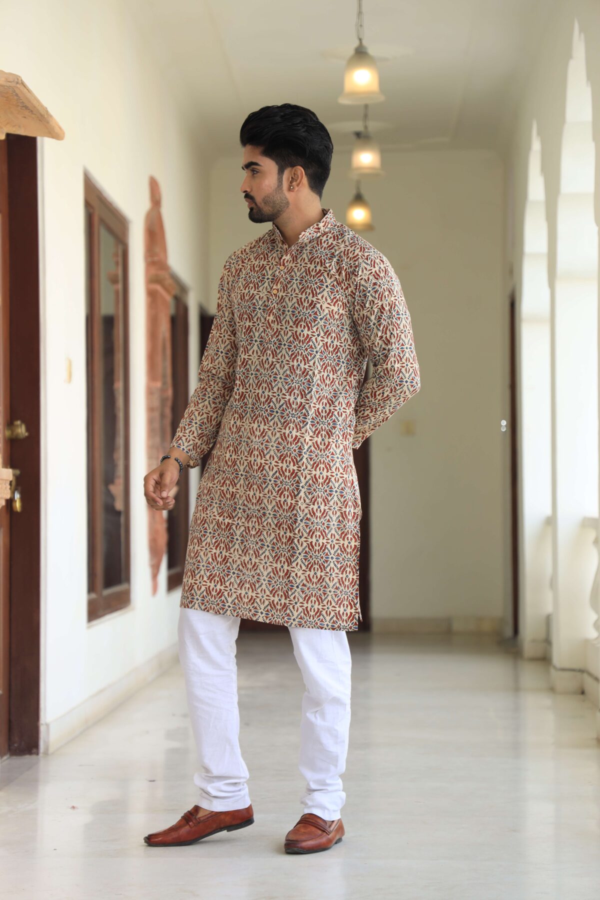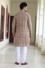 stylish Beige Multicolor printed cotton kurta set for men, paired Beige Multicolor with classic white pajama pants. Designed with a comfortable fit and elegant detailing, this kurta is perfect for festivals, weddings, parties, pooja ceremonies, and cultural celebrations. The breathable cotton fabric ensures comfort, while the subtle printed motifs add a touch of sophistication. Pair it with leather sandals or juttis to complete your traditional look.