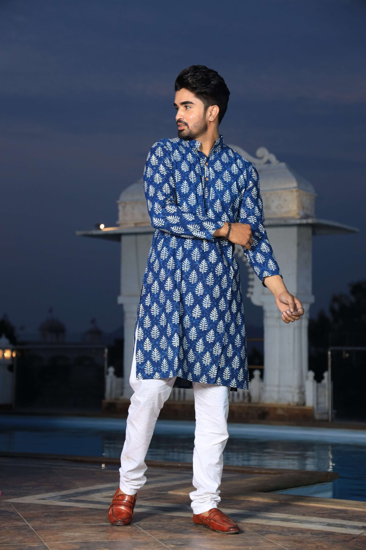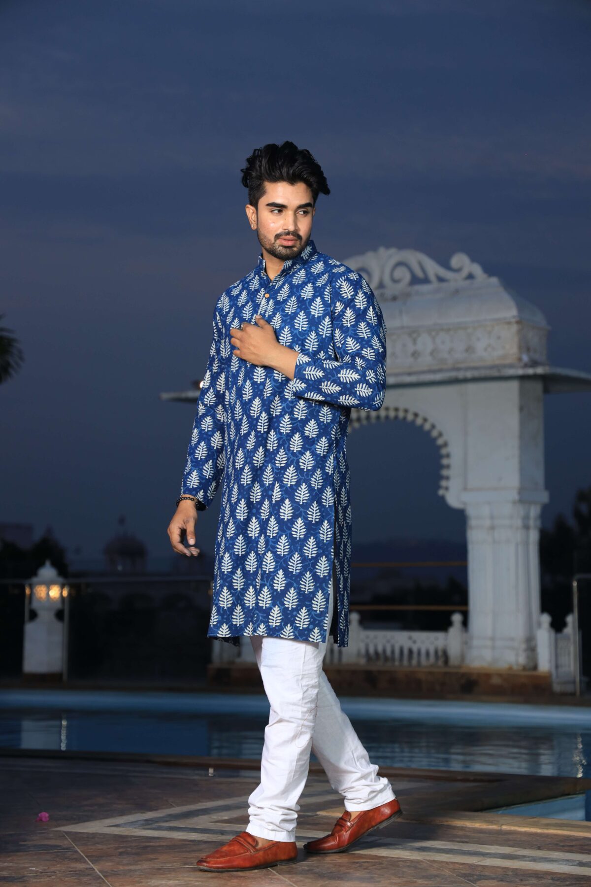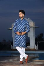 stylish Blue printed cotton kurta set for men, paired with classic white pajama pants. Designed with a comfortable fit and elegant detailing, this kurta is perfect for festivals, weddings, parties, pooja ceremonies, and cultural celebrations. The breathable cotton fabric ensures comfort, while the subtle printed motifs add a touch of sophistication. Pair it with leather sandals or juttis to complete your traditional look.