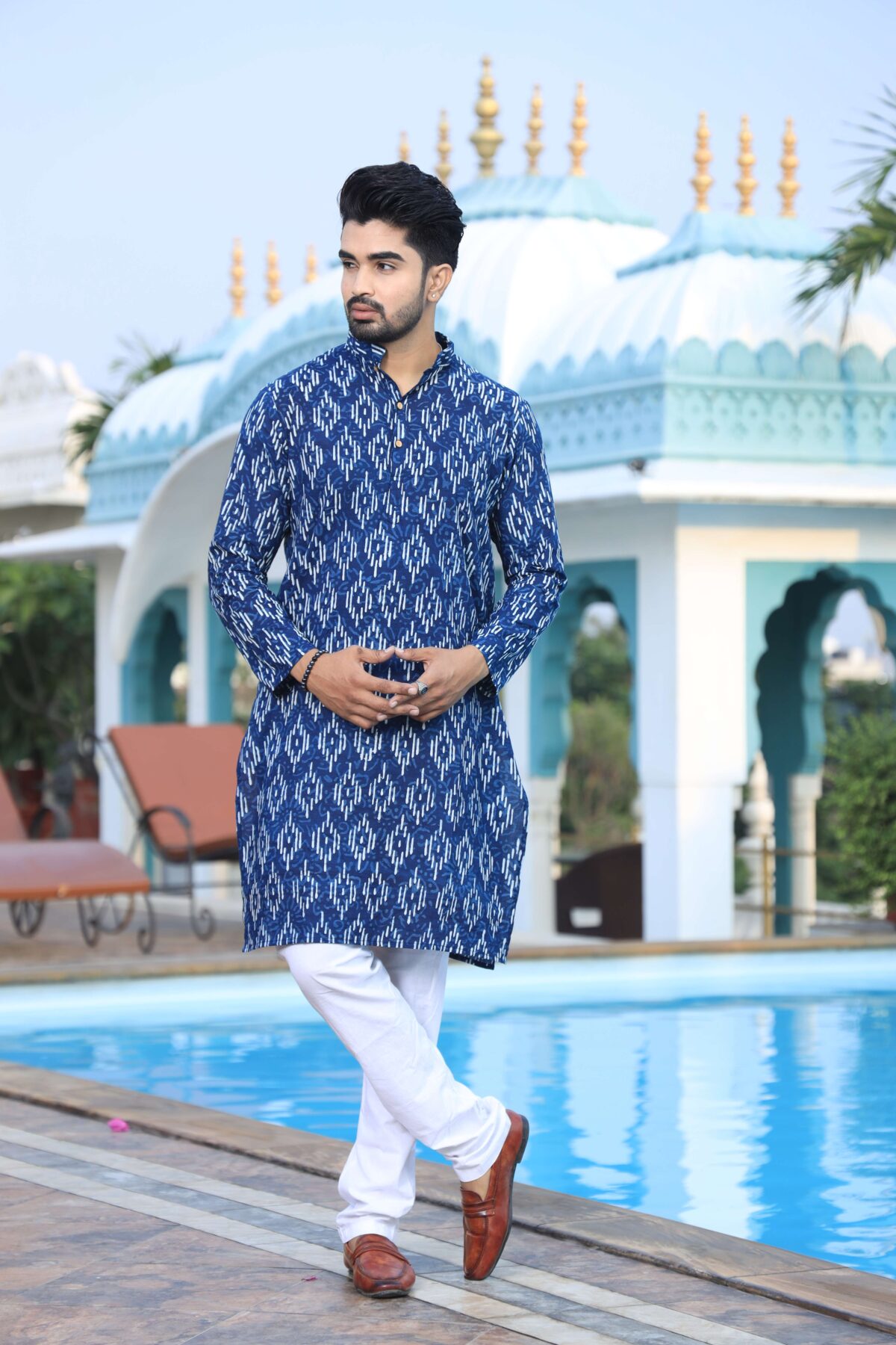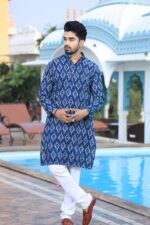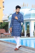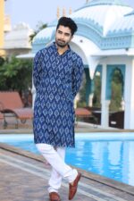stylish Blue printed cotton kurta set for men, paired with classic white pajama pants. Designed with a comfortable fit and elegant detailing, this kurta is perfect for festivals, weddings, parties, pooja ceremonies, and cultural celebrations. The breathable cotton fabric ensures comfort, while the subtle printed motifs add a touch of sophistication. Pair it with leather sandals or juttis to complete your traditional look.